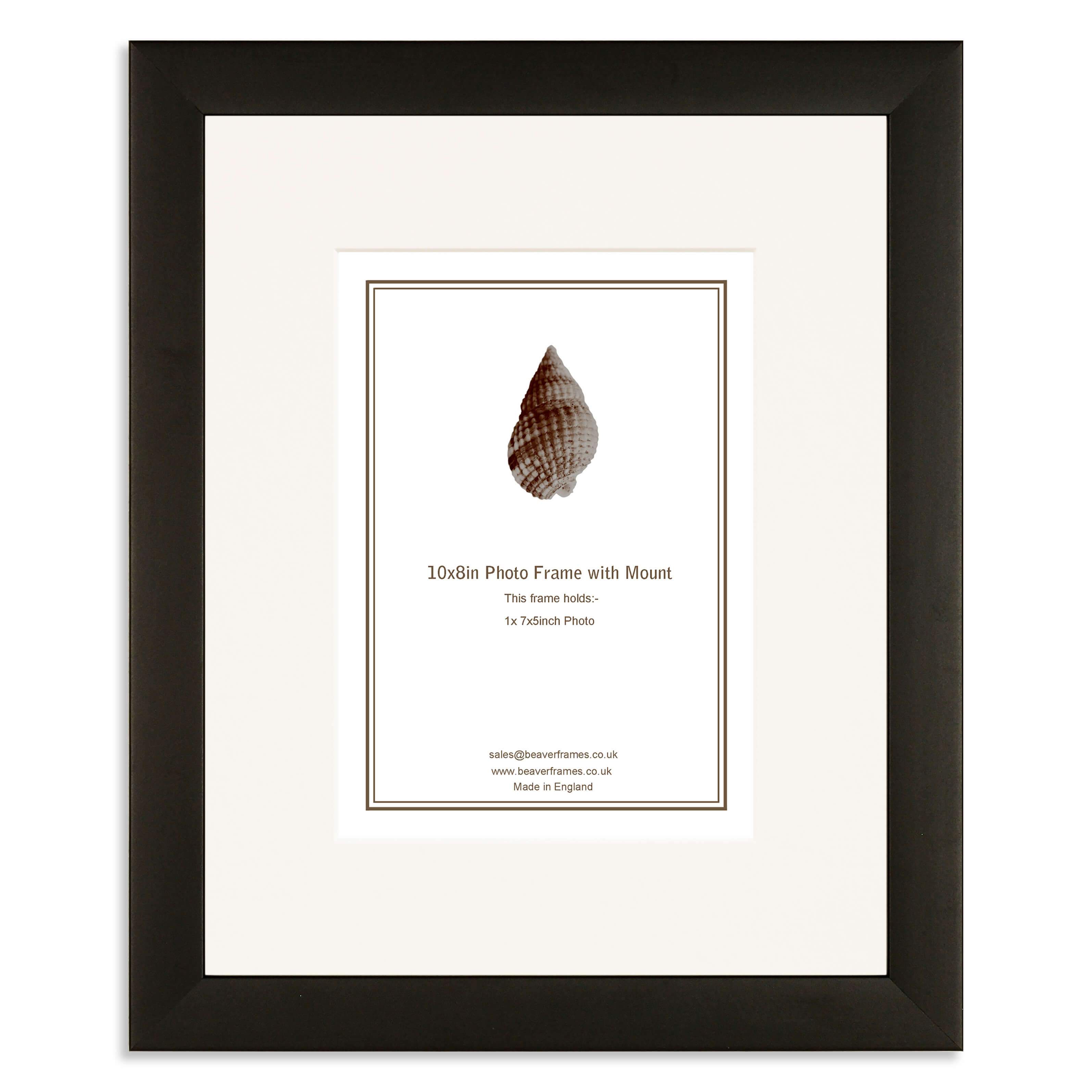 Preserve your precious memories with a contemporary Black wooden photo frameåÊhand crafted with an off white mount that holds aåÊ7x5inch photo.This 10x8inch Black frame will add an elegant touch to any room, whilst displaying a cherished photo or striking picture.åÊ Hang it on any wall or stand it portrait or landscape to instantly personalise walls, mantelpieces, side tables or windowsills.This stylishly simple frame is supplied with real Picture Glass, a desktop stand and a hanger for wall fixing.FEATURESFrame MaterialWoodFrame Width20mmFrame ColourSmooth Matt BlackFrame Size10 x 8inchesMount IncludedYesMount TypeWhite core/Acid FreeNo. of Apertures1Photo Size(s)7 x 5inchesMount ColourOff WhiteGlass TypeReal picture GlassDesktop StandIncludedWall HangerIncludedApprox Finished Size287 x 265mmProduct Code017/BLKParcel SizeSmallCountry of ManufactureUKåÊPHOTO PRINTINGHaven’t got your photo printed yet? Why not take advantage of our professional photo printing and fitting service. Simply select Photo uploaded below or Photo to follow on email from the drop down menu above.Photo uploaded below (preferred option) – use this to upload and edit/crop your photo on our server and then press Choose File.Photo to follow on email – if you need to send your photo separately, complete your order and then email your photo to sales@beaverframes.co.uk. Please ensure you include your order number so we can match the order to the frame. Unless your photo is formatted correctly we will edit/crop to fit.