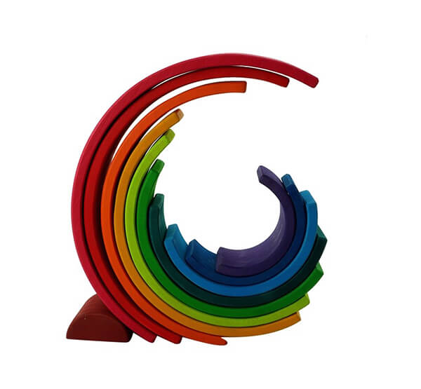 The rainbow stacker is cut from a single piece of wood and can be used in multiple ways for learning through play. Make a rainbow tower, bridges, a tunnel, a winding path, a wheel or even a tower.
