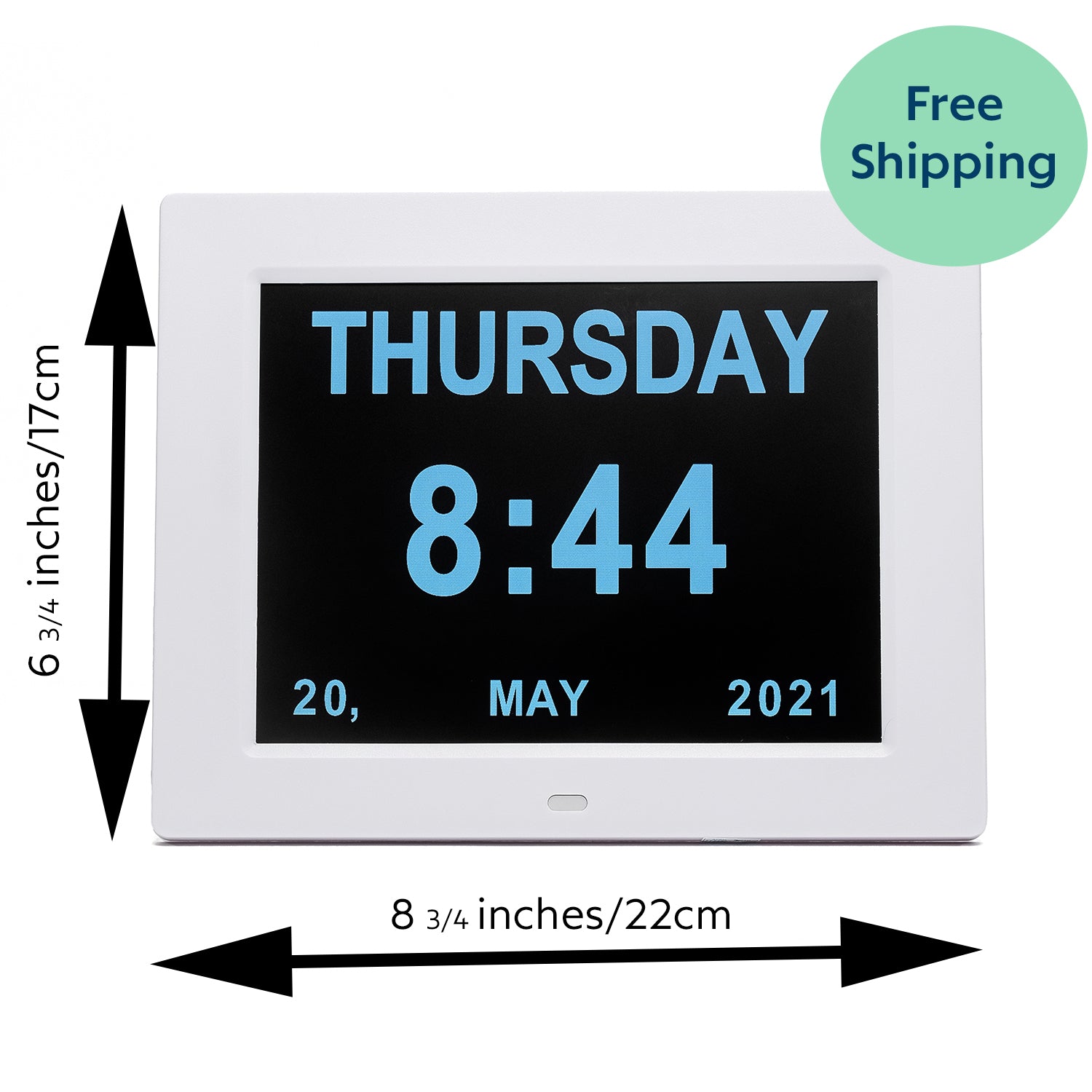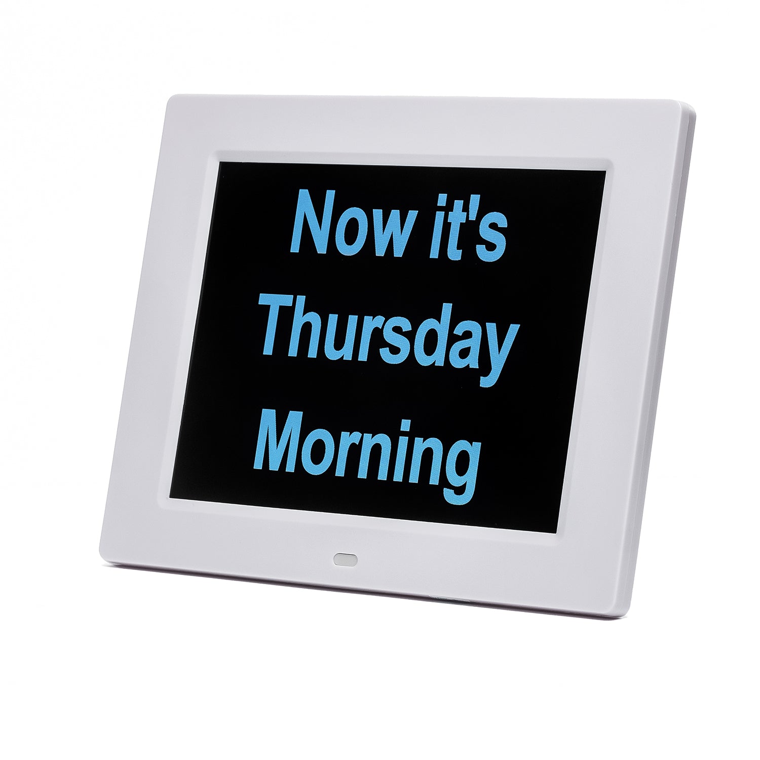 Ideal for people living with dementia. These clocks simplify the time to a simple calendar clock format or simply the time of day and the day of the week, for eg, Now its Sunday afternoon. Change displays with the push of a button. Day, Date, Year, Time (in 12 or 24 hour format) This clock has an 8 inch display from corner to corner. This product is mains powered. Why buy from Story and Sons? Story and sons are a family run business with a passion for product design and good old fashioned customer service. Most of our products are designed by ourselves, so if you have any questions please give us a call and we can talk you through any of our products. If you have a smart phone we can arrange a product demo or help with setting up over video call. Don’t forget we offer FREE delivery on all clocks and watches. We won’t be beaten on price, if you find our products cheaper elsewhere we will match it. Specifications Dimensions 217 x 173 x 23 mm Guarantee 1 Year Model TDC002 Time Format 12 Hour or 24 Hour Languages English, French, German, Spanish, Italian, Polish, Dutch, Welsh Power Source Mains Powered