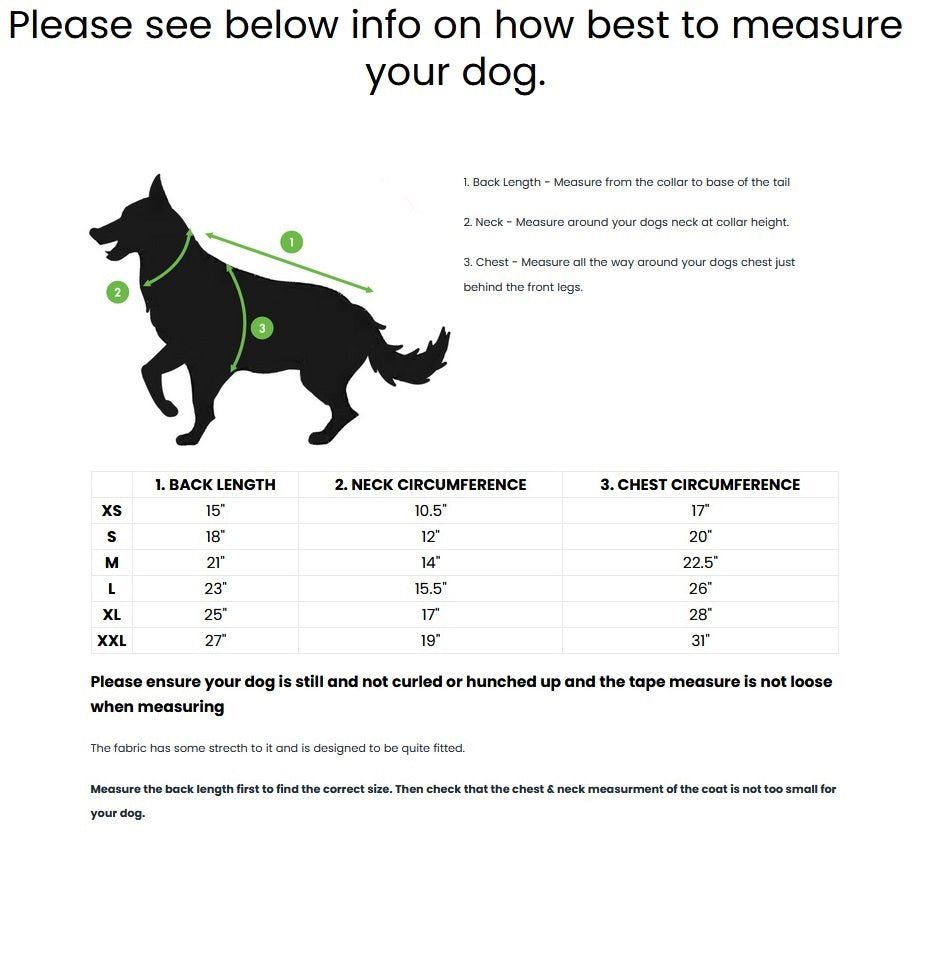 2 Leg Water Resistant Dog Fleece Handmade in the UK Suits general dog breeds Machine washable on a cool wash Designed for a snug fit Sizes XS-XXL (please check your dog’s measurements on our size guide) Our lightweight 2 leg dog fleeces are made from 100% polyester polar fleece, keeping your dog warm and being water resistant, completely dry underneath the fleece. The fleece is breathable and allows any water to quickly wick away from your dog’s coat.There are no fastenings on the fleece and the area between the back legs is open so that the fleece doesn’t interfere with toileting. However, fit should always be checked on the underside of the suit, particularly for a boy dog to accommodate their toileting.**Please note that this suit should not be used on hot weather days**