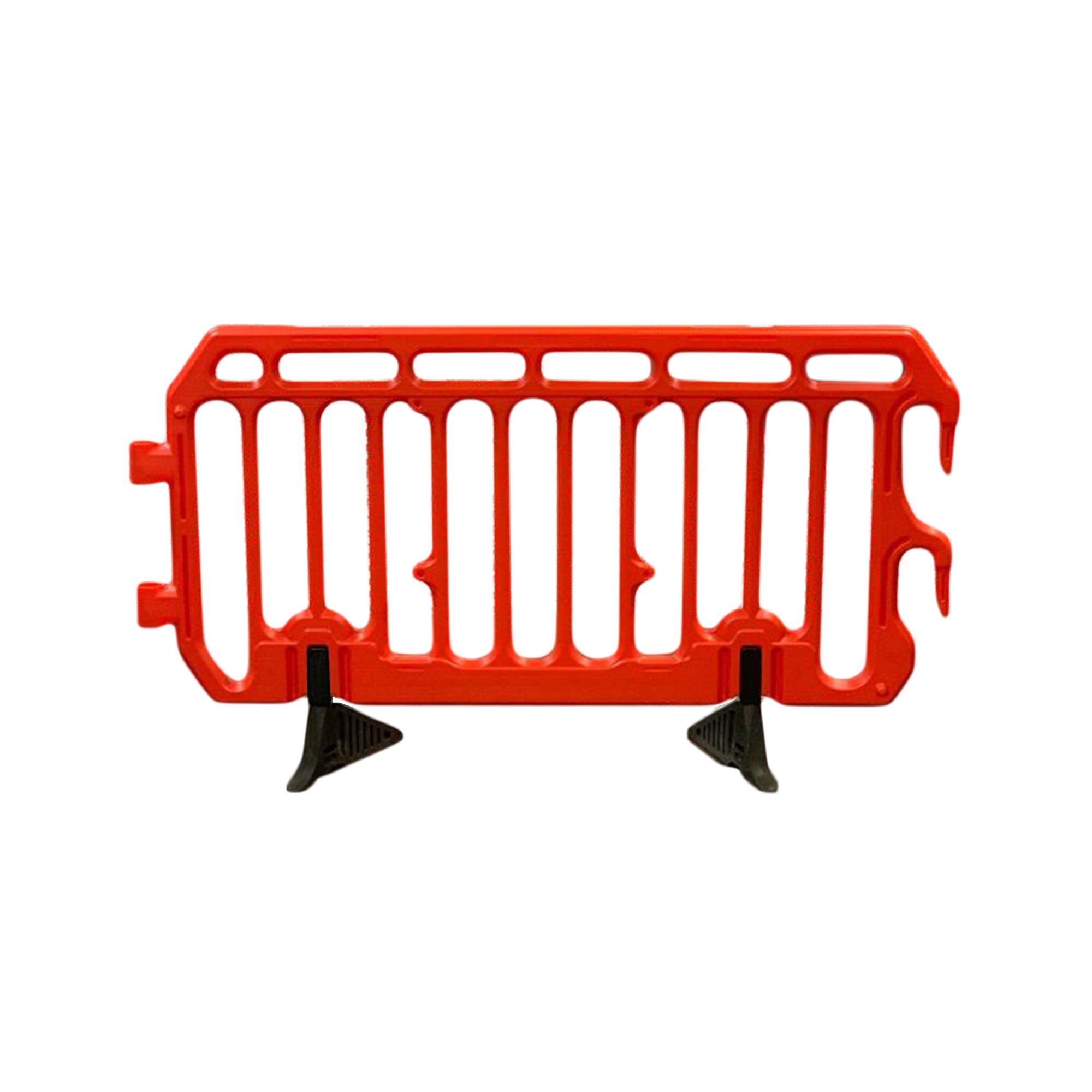 Product details The Crowd Control Barrier is a new 2 Metre Barrier aimed at replacing the outdated metal crowd control barriers. This product is manufactured from 100% recyclable materials and is fully customisable. There are a host of benefits to using this barrier in place of the metal barriers. Key Features: Free standing with 360° swivel feet, can be sent through pallet network easily. Free from screws and rivets. Barrier to barrier connection is quick and easy for use on uneven ground. Company identification can be embossed or Company Colour. Completely Recyclable. No sharp edges. Reduced theft. Manufactured from virgin HDPE. The Boss Barrier is an innovative approach to managing busy public areas , such as festivals , marathons , and events . The barrier is manufactured from recyclable blow moulded High Density Polyethylene, which boasts incredible durability and strength. This product is not chapter 8 compliant as it does not have a reflective strip along the top. We have plenty of other barrier alternatives that are Chapter 8 Compliant: Barriers Feet Options We are able to offer two types of feet for these barriers, both are removable/replaceable when needed. With this feature the feet are moveable to fold flat, making them easily stackable. Standard – Symmetrical design on each side offering a wide, extremely sturdy grounding. Anti-Trip – One side is standard with the other featuring a shorter “Stubbed” design, keeping feet safe when passing. Specifications Dimensions Depth -5cm when lay flat (66cm with feet open) Height – 113.5cm Width – 200cm Weight 10.7kg per piece Material Type – UV stabilised High Density Polyurethane (Body) Type – Fully recycled PVC (Feet) Colour Grey or Orange. Custom Colours upon request For more information on this product please read the Melba Swintex Crowd Control Barrier data sheet which is linked below, or get in touch via email or telephone 0161 706 0479. Melba Swintex Crowd Control Barrier Data Sheet Have Questions About The Boss Barrier If you have any questions about this superb plastic crowd control system then please contact our sales team on 0161 706 0479 . Our sales team will be happy to answer any questions that you may have. Or send us an email here. Customisation Customisation of the Boss Barrier is available in 3 different ways. Custom colours – This barrier can be manufactured in almost any colour you require to match your corporate branding or event theme. Please Contact Us for pricing and lead times. Customised embossing – Want your name, company logo or branding moulded into the plastic? No problem! We can have custom tooling cut that allows us to mould directly into the barrier with any branding you like – it won’t peel or fade over time, unlike stickers. Laser Printed Engraving – We have the facilities to fully laser ink print any customers name directly onto the barrier. Please get in touch for more information and quotes. (Order quantity of 15 minimum) Click Here for Personal Quotes on Custom Orders Delivery We are proud to offer next working day delivery on all in stock items when ordering before 10am If you require pre-9:00, pre-10:00 or other requirements for delivery please phone us for a price on 0161 706 0479. Or visit our Delivery Information page for further information. We work with several courier services to provide our customers the best prices and value when ordering with us. 2M Crowd Control Barrier Anti-Trip / Orange Street Solutions UK