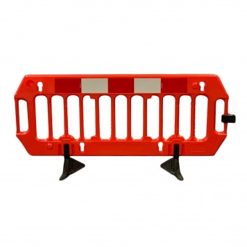 Description The Tuff Barrier is one of our most popular stackable pedestrian barrier. It is also an important part of our line of chapter 8 barriers . This plastic barrier system is commonly used for road works, site works, events and exhibitions all over the country. The optimised design and construction makes the Tuff barrier easy to deploy, use, handle and store. Features Manufactured from virgin HDPE. Highly reflective sleeves (360°) on two vertical spindles for improved visibility. Q-Clip support for barrier to barrier connection. Hook & Eye connection to other barriers. Compatible with Gate barriers. Customer identification may be embossed into Barrier body. Available in other colours upon request. Feet Options The Barrier can have different feet the one with a symmetrical design is the ‘Standard Foot’ and comes as standard when purchased. The Foot asymmetrical design is the ‘Anti-Trip Foot’ this is designed to reduce the potential of a trip hazard. Both these feet have full 360-degree rotation and allow for neat stacking. Specifications Dimensions Depth – 50mm Height – 1000mm Width – 2000mm Weight 10.5kg per piece with the standard foot 11.2kg per piece with anti-trip foot Material Type – UV stabilised High-Density Polyurethane (Body) Type – Fully recycled PVC (Feet) Colour Orange. Custom Colours upon request. For more information on this product please read the Melba Swintex Tuff Barrier data sheet which is linked below, or get in touch via email or telephone 0161 706 0479. Melba Swintex Tuff Barrier Data Sheet Have Further Questions Regarding The Tuff Barrier? Phone today and speak to one of our sales team; they will happily talk to you about your individual barrier requirements ensuring you get the right barrier for your needs. Our sales team can be reached during office hours on 0161 706 0479 Customisation This barrier is amongst those that we can get tailored to suit your requirements. This customisation includes custom colours and embossing of company names and branding. There are minimum order quantities when ordering custom colours, so please contact our sales office on 0161 706 0479 or contact us here to discuss your requirements. We offer Four types of customisation on the Tuff Barrier. Embossing : There is a minimum order quantity of 40 for custom embossing on the Barrier. This carries a tooling charge dependent on the size/complexity of your design. Please get in touch for more details. Laser Printed Embossing : Company name can be ink printed onto the product. Please get in touch for more details on price. The minimum order quantity is 10. Colour : There is a minimum order quantity of 120 for custom colours with the Gate Barrier. The additional cost can vary per colour. Custom Stickers : Custom stickers can be made for the barrier. This is great for branding of events or additional notifications. The minimum order quantity is 10. Click Here for Personal Quotes on Custom Orders Delivery If you require pre-9:00, pre-10:00 or other requirements for delivery please phone us for a price on 0161 706 0479. Or visit our Delivery Information page for further information. We work with several courier services to provide our customers with the best prices and value when ordering with us. 2M Tuff Barrier Anti Trip Red / White Colour Street Solutions UK