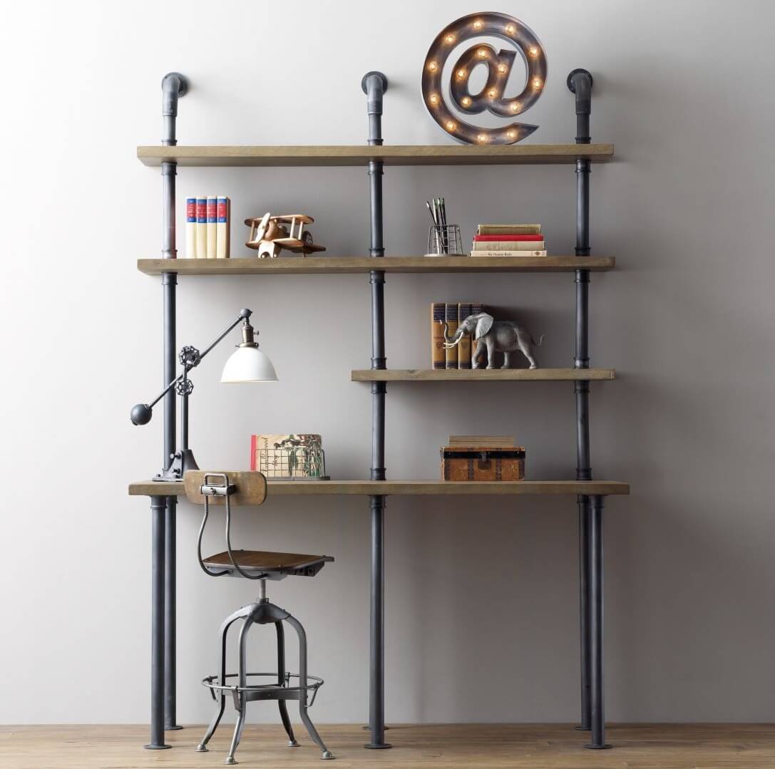 Sturdy steel pipes and matching cast fittings serve as the structure for our industrial pipe office desk, while weathered or modern finished wood planks provide support for books and a workspace for the industrious.