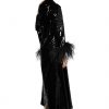 THE ADELAIDE MIDI DRESS IN BLACK SEQUIN IS A DRAPED ONE-SHOULDERED DESIGN. IT AS FULL LENGTH SLEEVES FINISHED WITH AN OSTRICH FEATHER-TRIM. ADELAIDE IS MADE IN BLACK SEQUIN EMBELLISHED MATERIAL WITH SLIGHT STRETCH AND FASTENED WITH A CONCEALED ZIP.