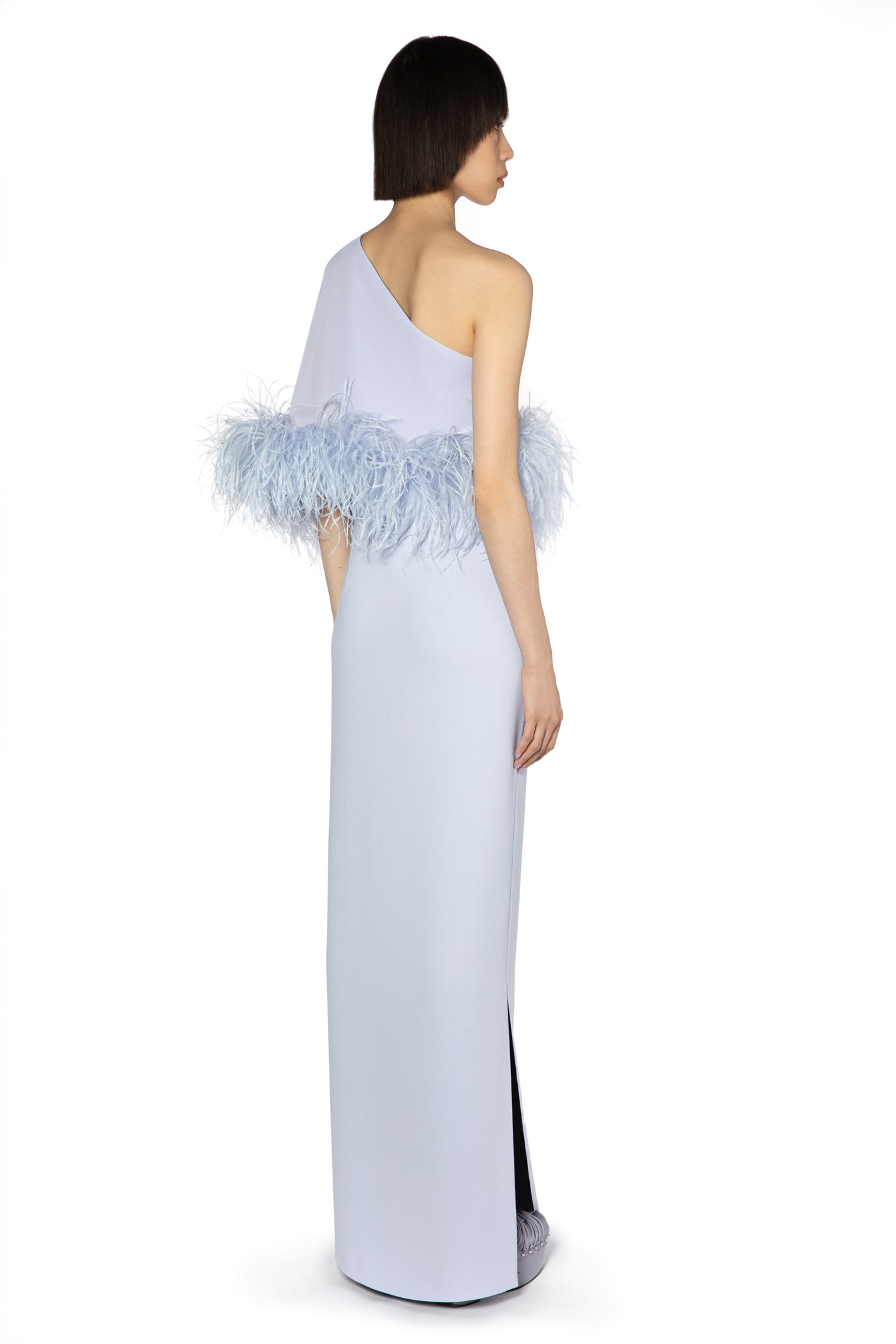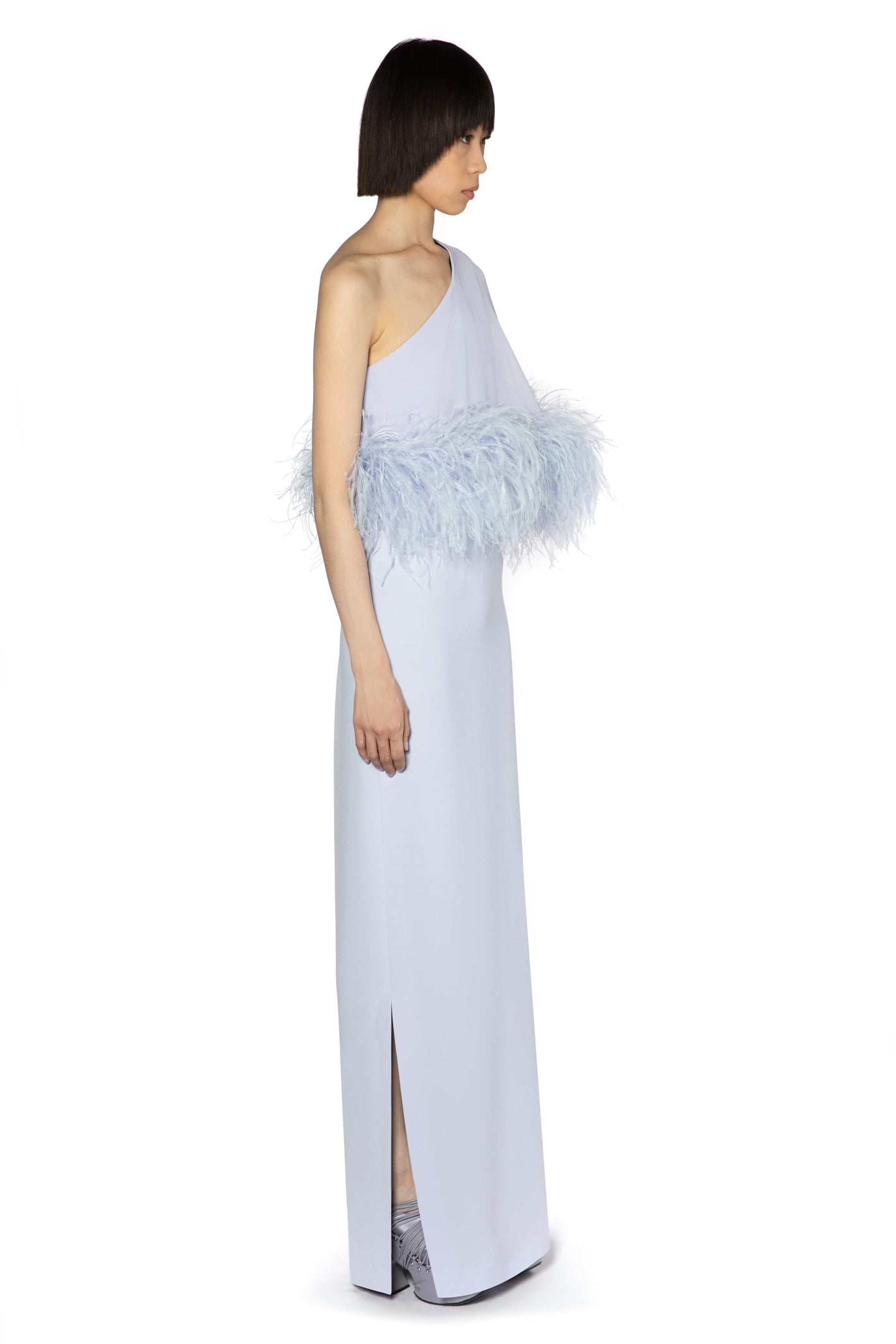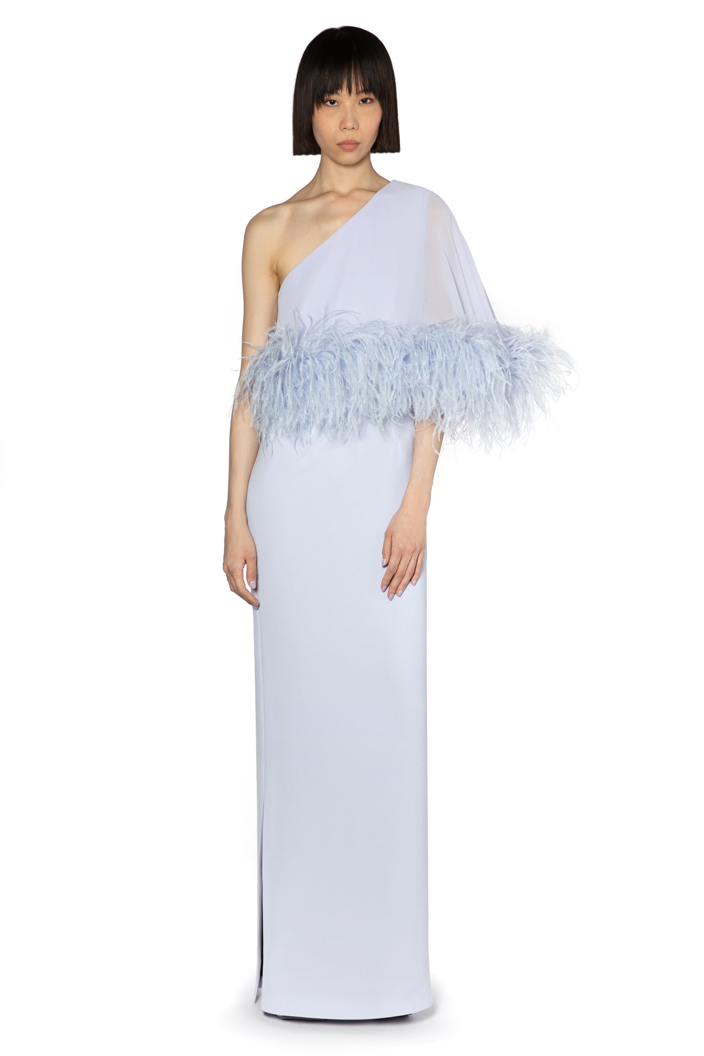 THE ALDER CAPE GOWN IN LAVENDER CREPE IS FULL LENGTH AND CUT IN A RELAXED FIT. IT FEATURES A FEATHER TRIMMED CHIFFON CAPE OVER THE SHOULDERS AND HAS AÂ CONCEALED ZIP FASTENING ON THE SIDE.