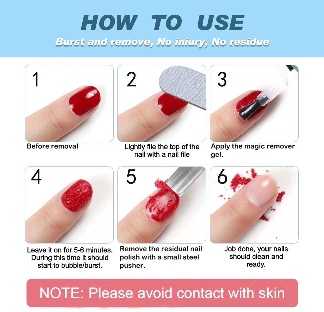 This Magic Soak-Off Gel Polish Remover does the trick –quickly and safely! Easy to use, just lightly smear, the nail surface will automatically burst after 3-5 minutes.