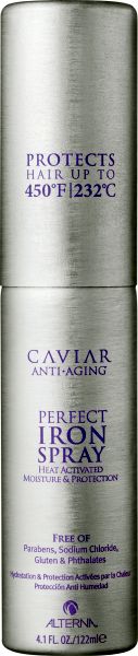 Incredible protection for your hair whilst styling.This heat activated styling spray protects each strand up to 450 deg. (176) F/232 deg. (176) C, seals in moisture to eliminate frizz and split ends and helps lock out humidity for long-lasting style.Research results:Clinical results show that Caviar Perfect Iron Spray protects hair up to 450 deg. F/232 deg. C and reduces breakage by 80%.Suggested Usage:Spray on clean, dry hair one section at a time prior to using heat styling tools. Repeat section by section until style is complete.