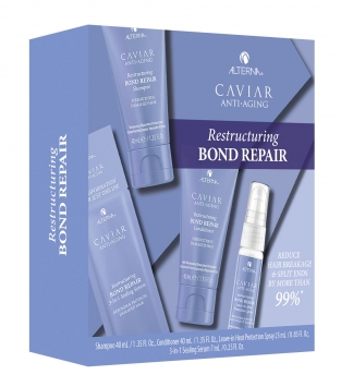 Alterna Caviar Restructuring Bond Repair Trial Kit This amazing kit is perfect for travelling or for any business trip it is also great to test out the products before buying the full size bottles. The trial kit can also be used as a stocking filler this Christmas. The trial kit includes:Alterna Caviar Restructuring Bond Repair Shampoo 40mlAlterna Caviar Restructuring Bond Repair Conditioner 40ml Alterna Caviar Restructuring Bond Repair Leave-In Heat Protection Spray 25ml Alterna Caviar Restructuring Bond Repair 3-in-1 Sealing Serum 7ml