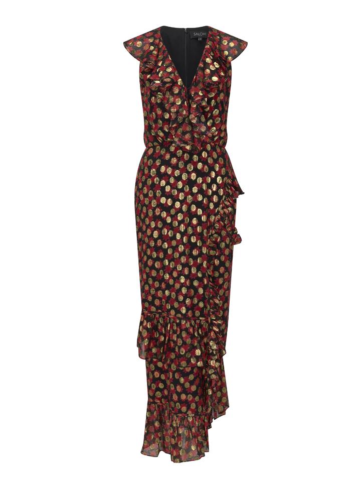 Description The signature Anita returns in a scarlet and gold polka dot print on shimmering silk jacquard. This sleeveless midi length dress exudes femininity, from the flouncy deep V-neckline to the wrap over asymmetric skirt, front slit and with cascading frill detailing.Details • Asymmetric Midi Dress• Plunging V-Neckline• Flounce Frill Along Neckline• Lightweight Floral-Print Fil-Coupé Georgette• Cascading Ruffles• Fitted Waist• Panelled Skirt With Front Side Split• Asymmetric Hemline Outlined With Flounce Frills• Concealed Centre Back Zip Fastening• Fully Lined• Length on UK size 8 is 116.2 CMComposition & Care 48% Rayon, 34% Silk, 18% Metalic Fibres Dry Clean Only Avoid Contact With Suntan Lotion / Oils And With Harsh Chemicals