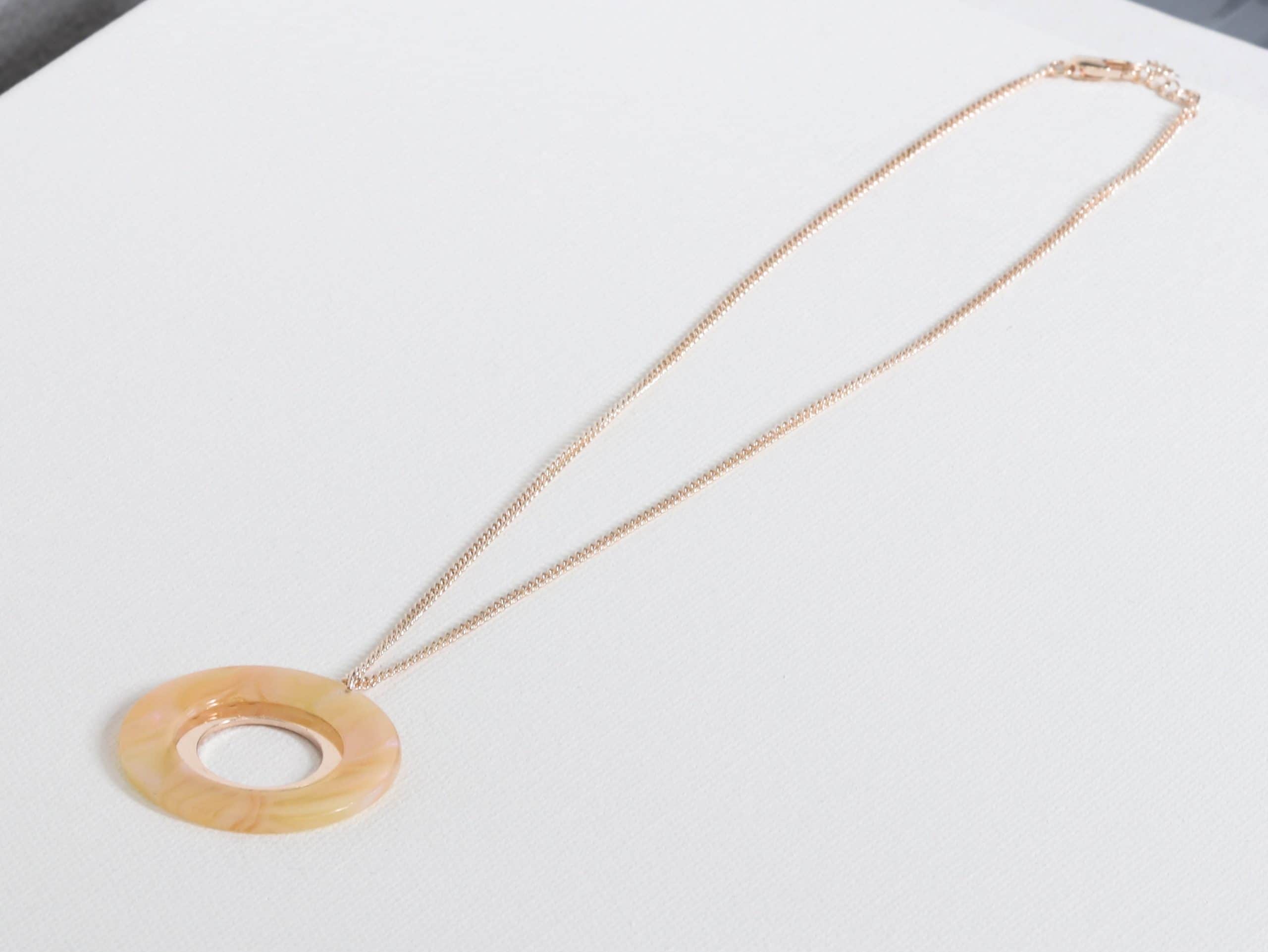 For a subtle statement touch, this pendant necklace features a large round loop pendant decorated with resin inlay, suspended from a gold-toned chain.