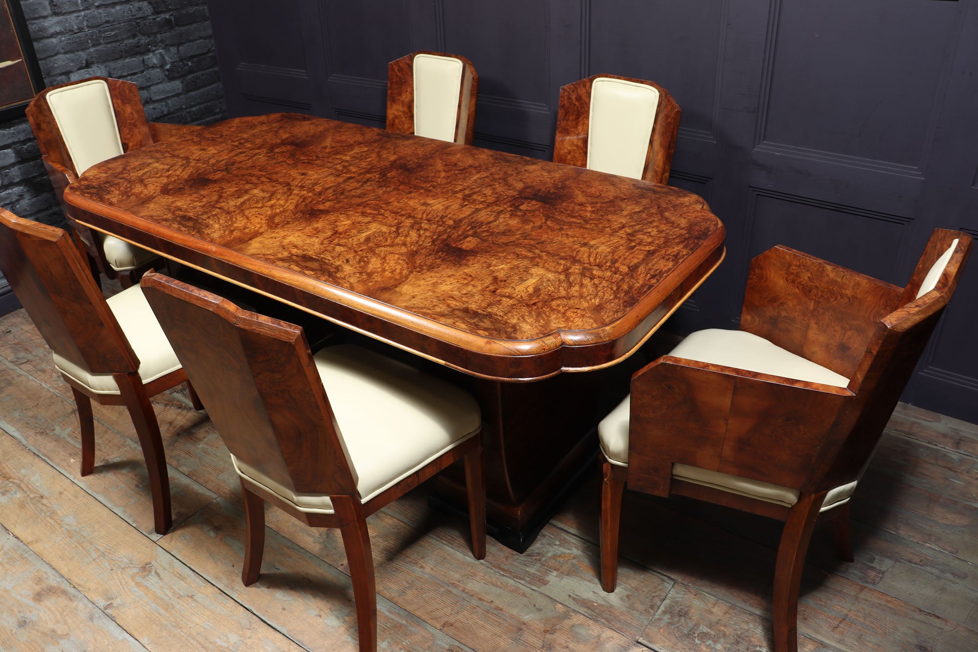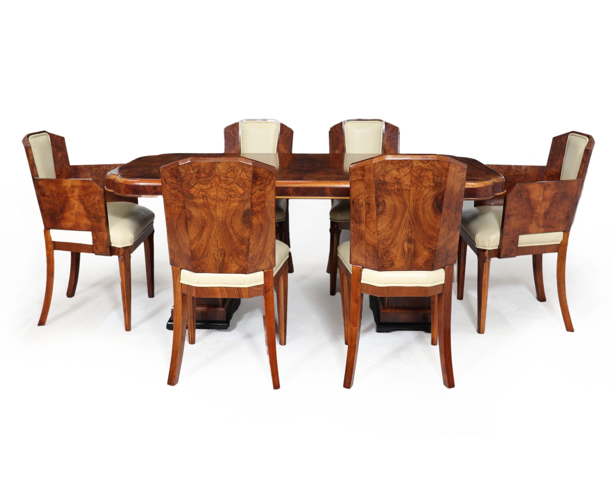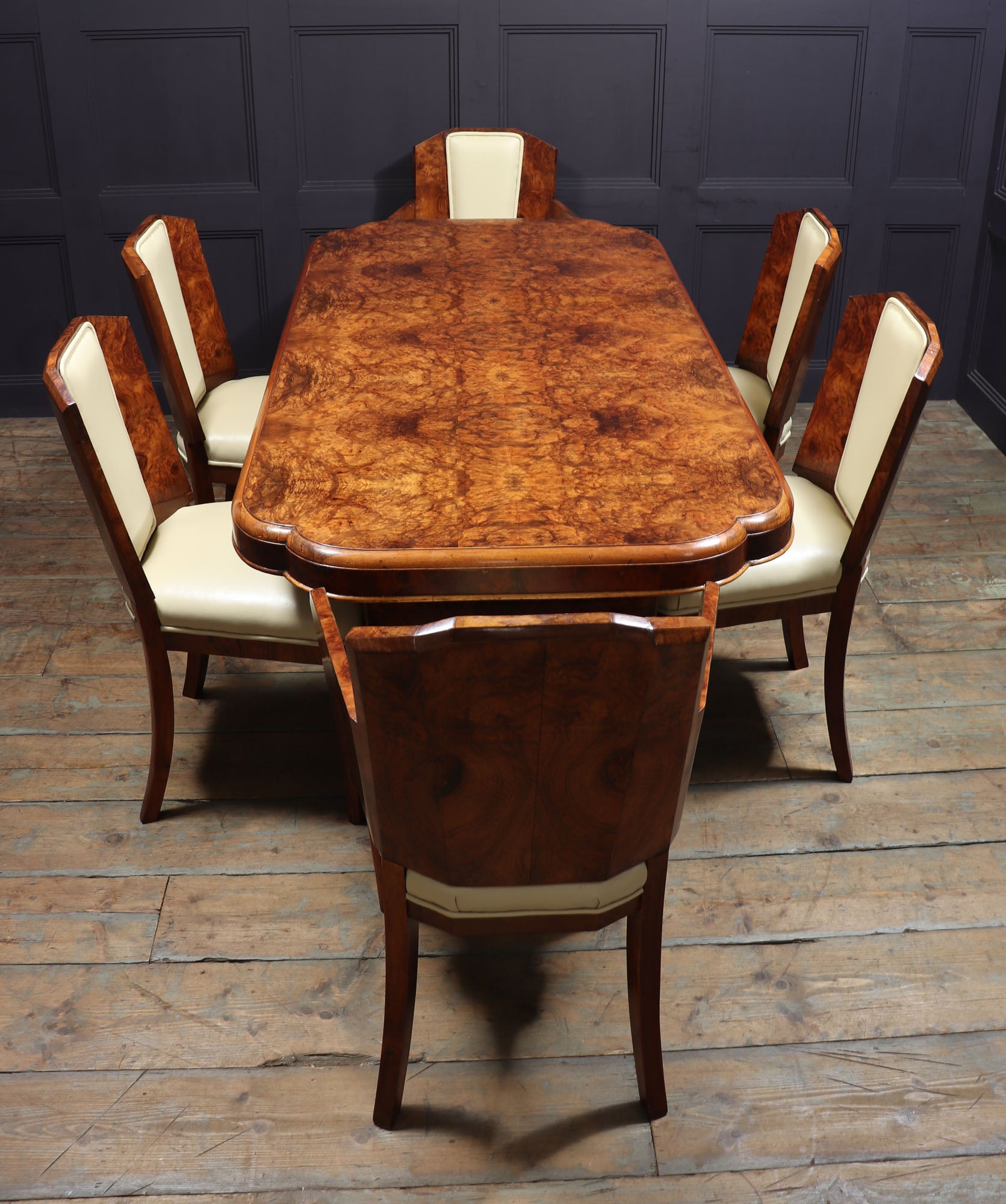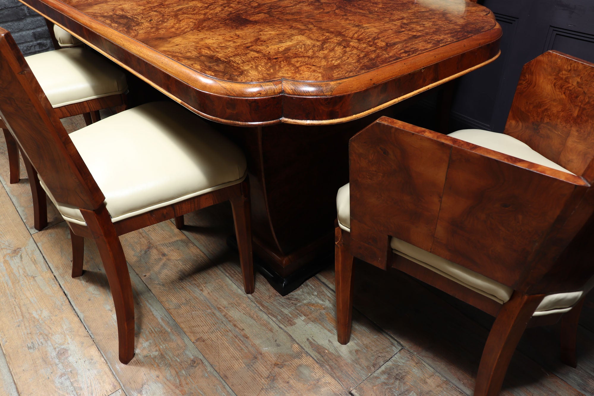 This Art Deco Dining Table and Chairs by Hille is the perfect way to add a touch of luxury to your home. produced in the 1930 by top cabinetmakers of this era the table has a cloud shaped top and two pedestal upright all in burr walnut, the matching chairs consist of