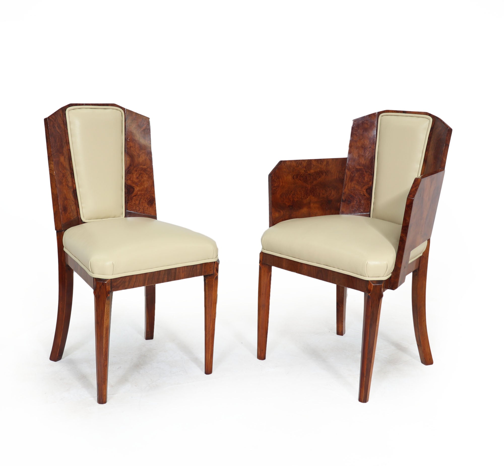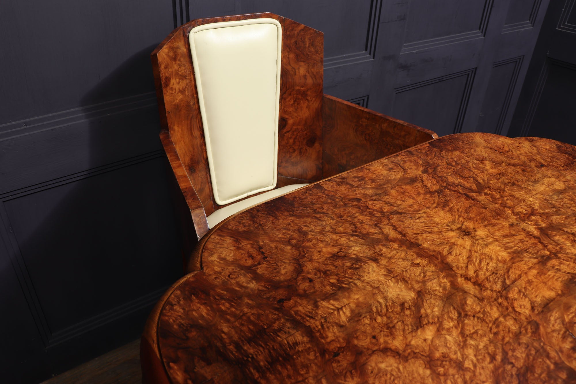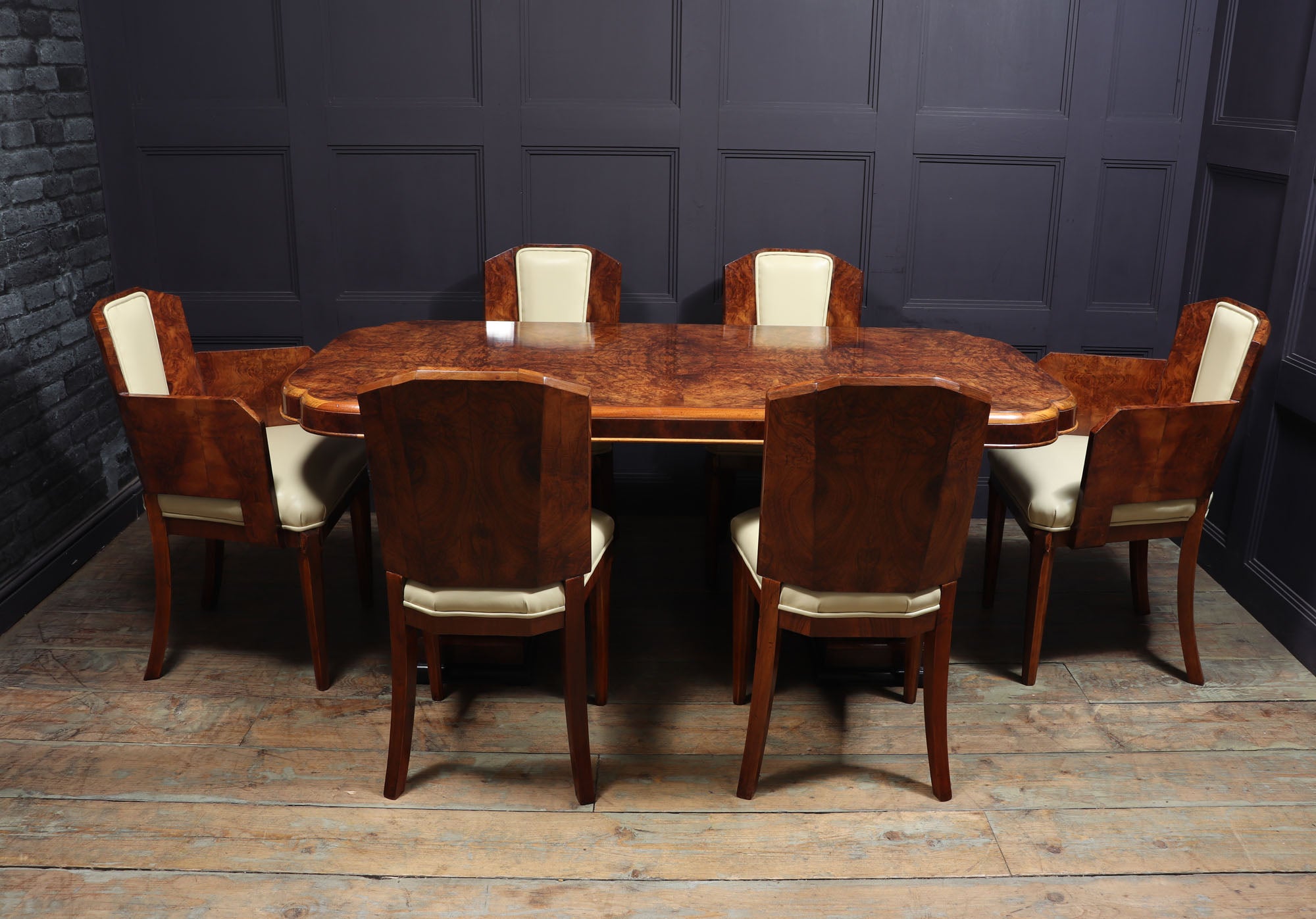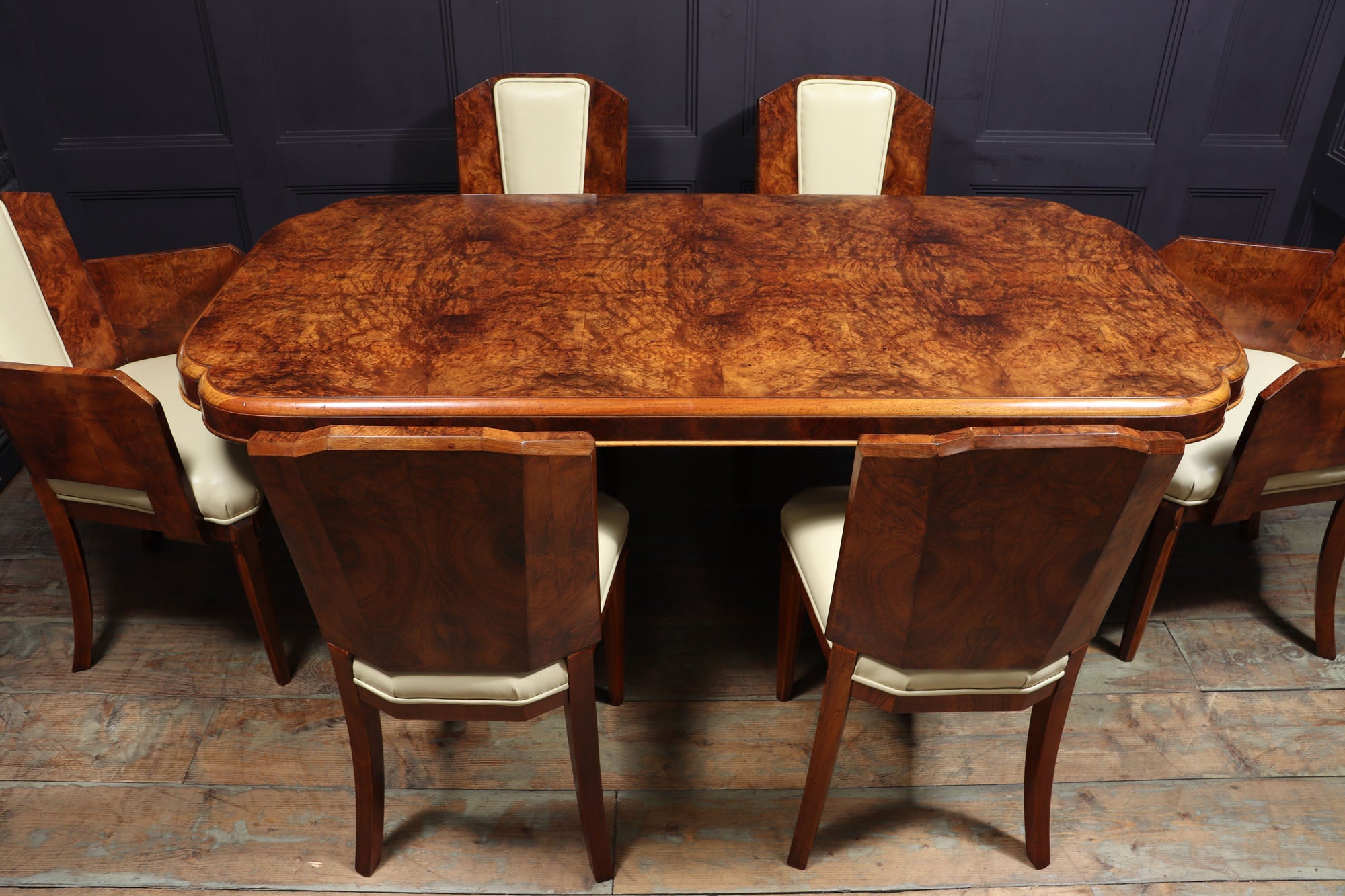 This Art Deco Dining Table and Chairs by Hille is the perfect way to add a touch of luxury to your home. produced in the 1930 by top cabinetmakers of this era the table has a cloud shaped top and two pedestal upright all in burr walnut, the matching chairs consist of