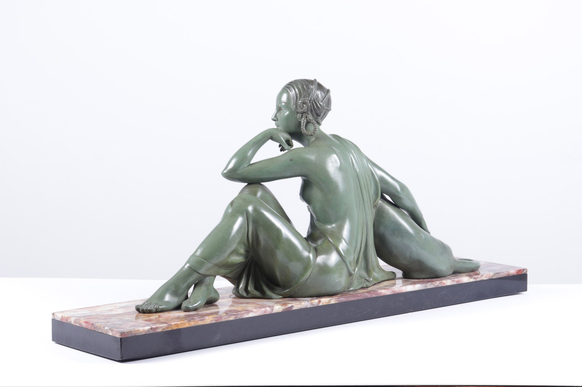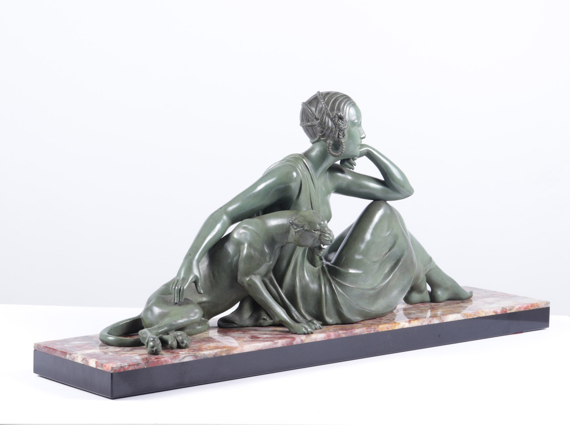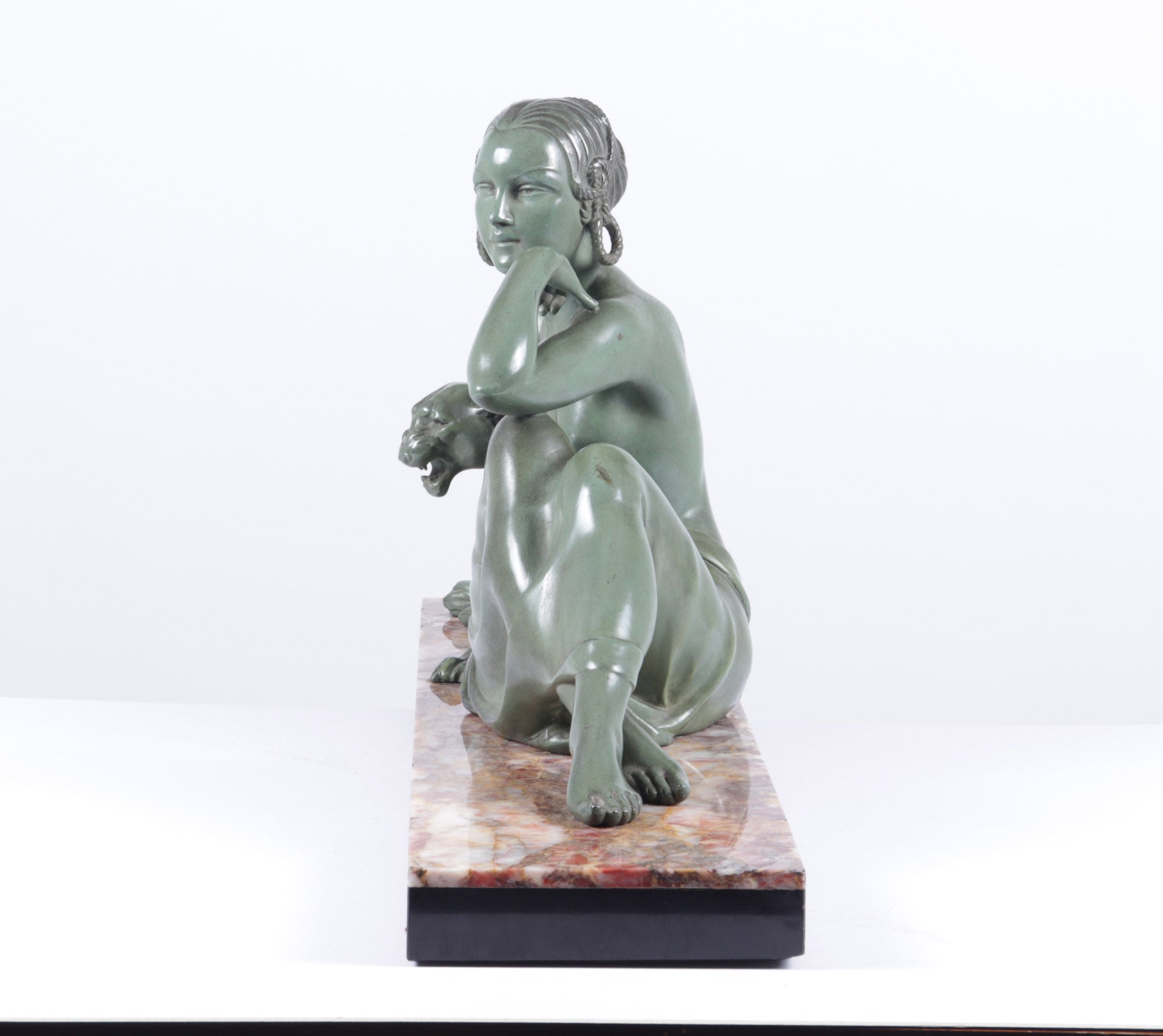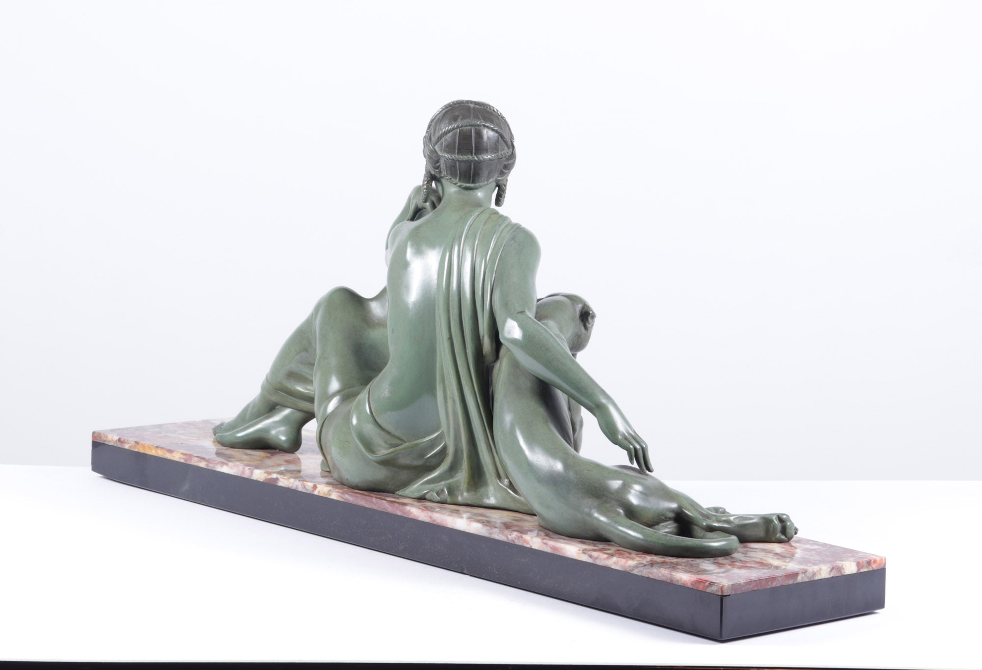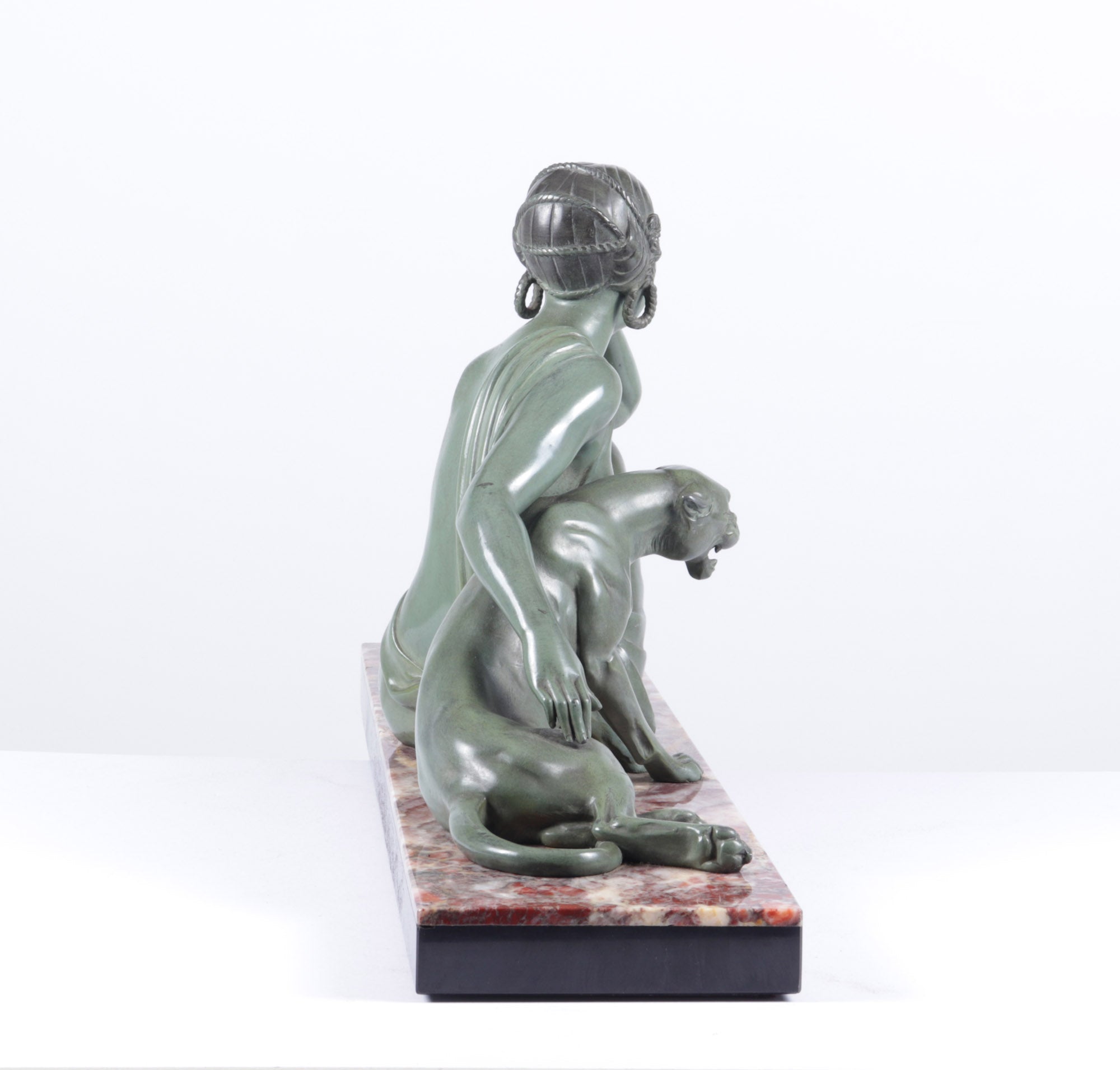 Impressive Art Deco group of a lady with a panther. This large sculpture is in excellent condition has a lovely patina and is mounted on a beautiful marble base Literature: ���Art Deco sculpture��� by Victor Arwas, Academy.?���Statuettes of