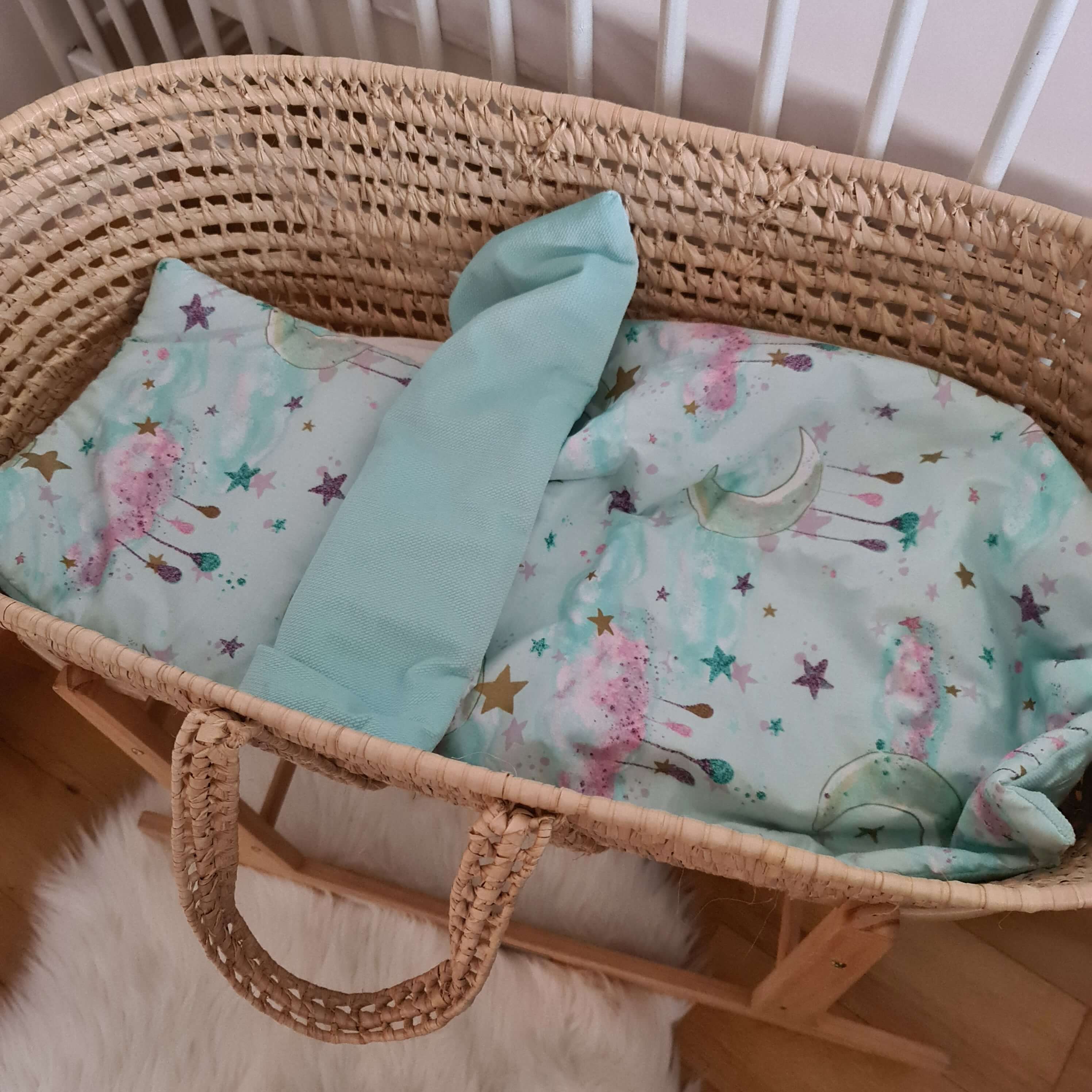 Product description: EvCushy set Blanket with pillow blanket dimensions: 50 x 75 cm, Flat pillow dimensions : 25 x 30 cm, weight about 0.2 kg, colour/print : aqua/ moon 100% cotton, 100% velvet – double – sided blanket with a warming breathable filling Our double-sided blanket and pillow set is designed for little babies. The blanket is lightweight and the pillow flat so the set can be used from the first days of life and make him/her feel comfortable and safe. The child will be warm, cozy and comfortable. Colorful warm blankets for children are double-sided. Made of certified 100%cotton and extremely soft velvet. One side is plain in colour while the other has beautiful cotton print. They have been created especially for babies. Their filling consists of anti-allergenic filling which is certified with Oeko-Tex® Standard 100 certificate. It means that they are safe for children from the first days of their lives. What is more the blanket will not cause allergies and will ensure your children a peaceful and healthy sleep. This extremely lightweight set can be used as a pram blanket, cot blanket, car seat blanket Or any other purpose you like. Our set can make a stylish gift for little babies e.g. for a baby shower. How to care: hand wash at 30º or in a washing machine with a delicate program, do not spin, iron cotton fabric at temperatures up to 110 degrees C, use mild detergents, do not use bleach, do not tumble dry.