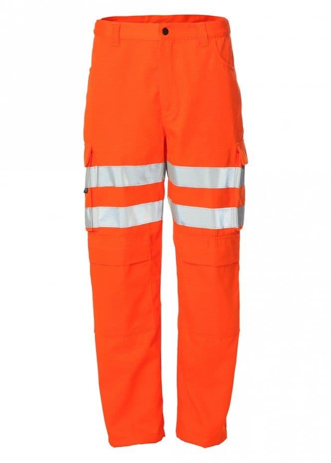 These are our Network Rail approved orange heavyweight hi vis trousers. These trousers have been carefully selected, trialled and successfully worn within industry to assess their fitness for purpose. Approved to BS EN ISO 20471 Class 1, RIS-3279-TOM, BS EN ISO 13688280g/m2 80% polyester / 20% cotton high visibility orange fabric Reflective tape around thighs to improve visibility when working in trenches Side waist elastication with five belt loops and zip and jean button fastening to keep the trousers secure and comfortable Shaped side pockets, two bellow thigh pockets with stud fastenings, two rear patch pocket with stud fastening allow you keep your belongings and tools to hand Top loading knee pad pockets mean you can wear knee pads to protect you when kneeling or crawling Washable at 40° and suitable for industrial laundering