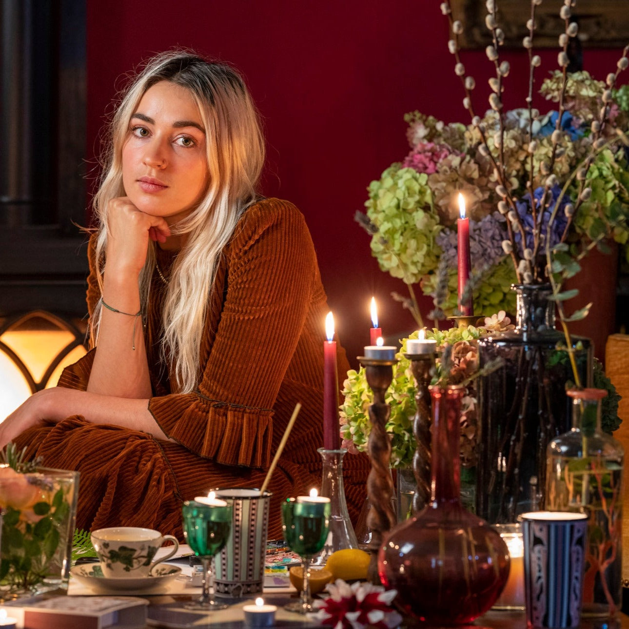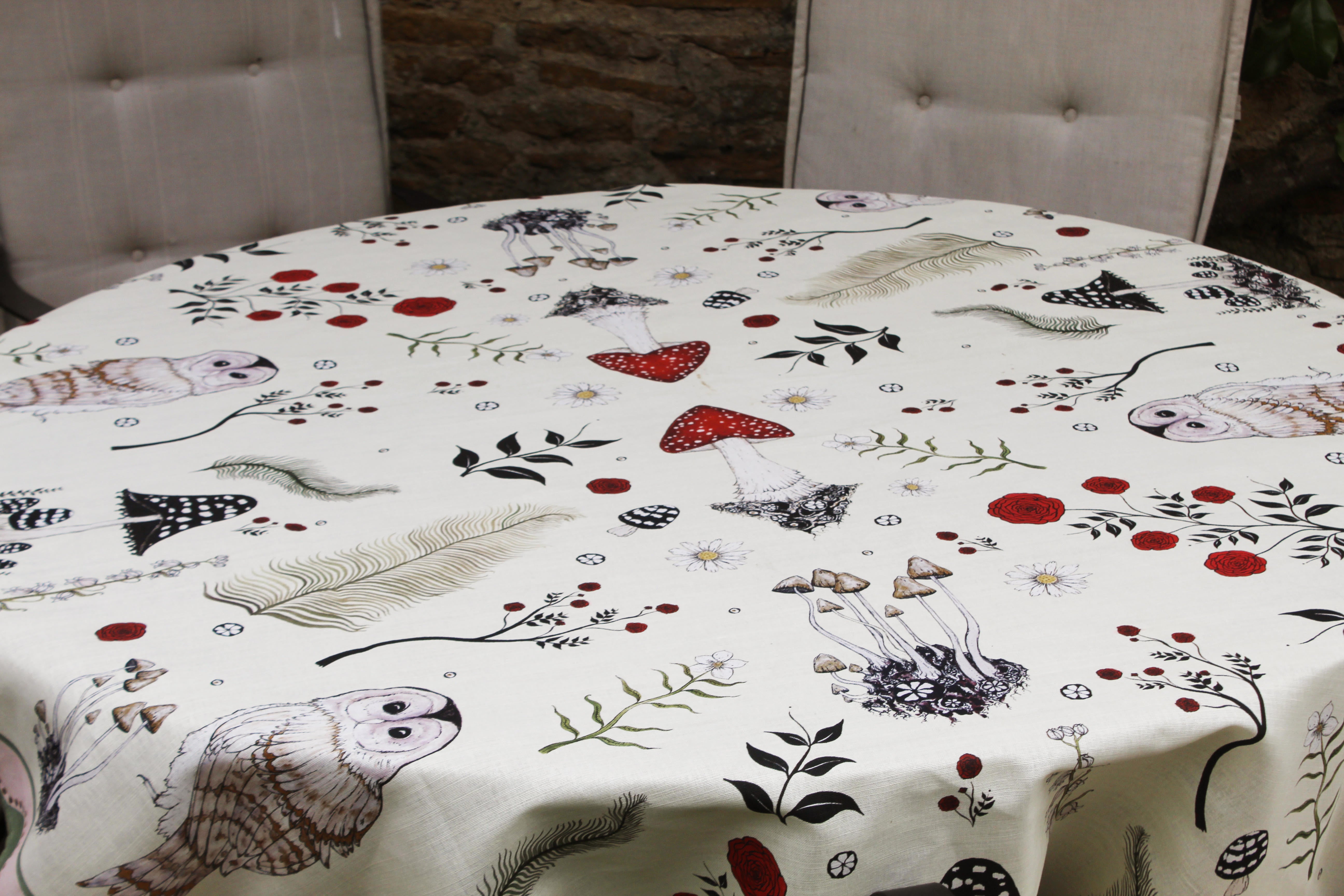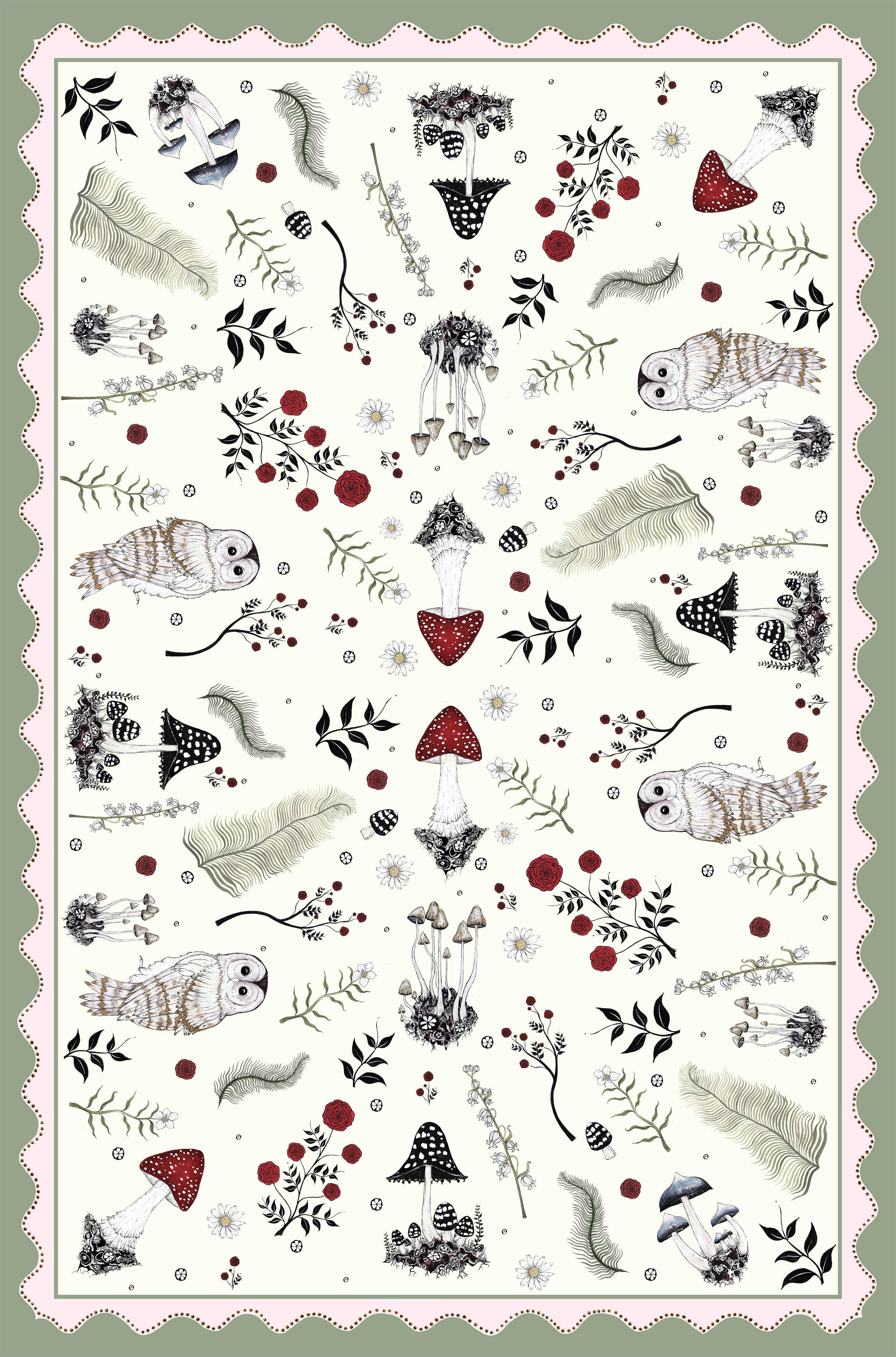 Bell Hutley Forest floor Table Cloth Bell is a London based artist work is whimsical and highly detailed extravagance illustrations of owls, ferns and flowers scalloped print edges Clean green & white with soft spring pink Materials 50% Linen 50% Cotton Dims 149 cm x 225.77 cm Made in UK 6- 8 guests Delivery 2-3 days