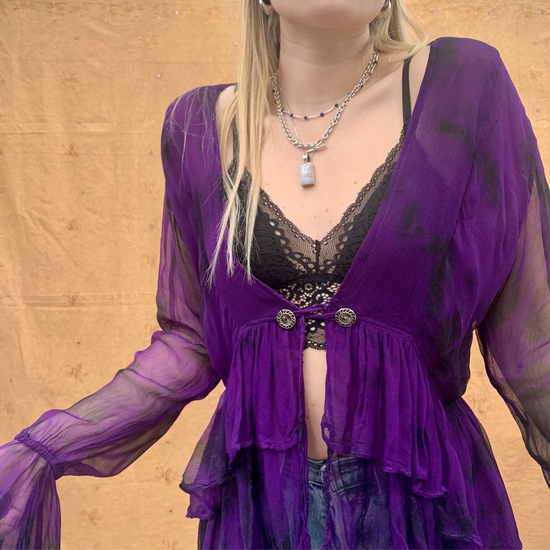 Gothic chiffon peplum jacket/top with bell sleeves. Layered frills that flare out from the waistline, super flattering for the figure. The jacket fastens with two buttons at the front. Available in different deadstock colours. Would fit sizes 6-12 comfortably. Message for measurements! Model is size UK 8 5ft 6.5 for reference.