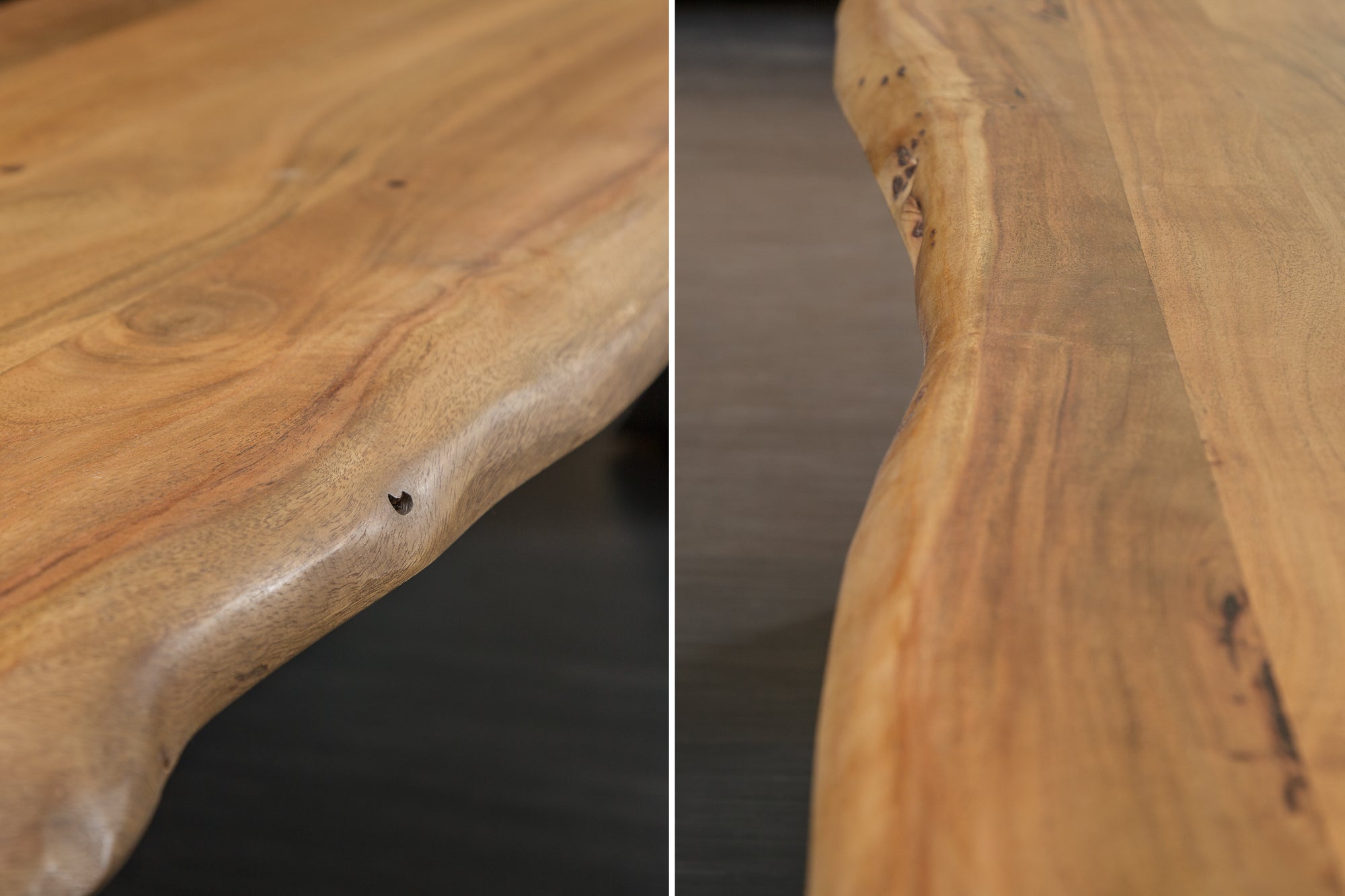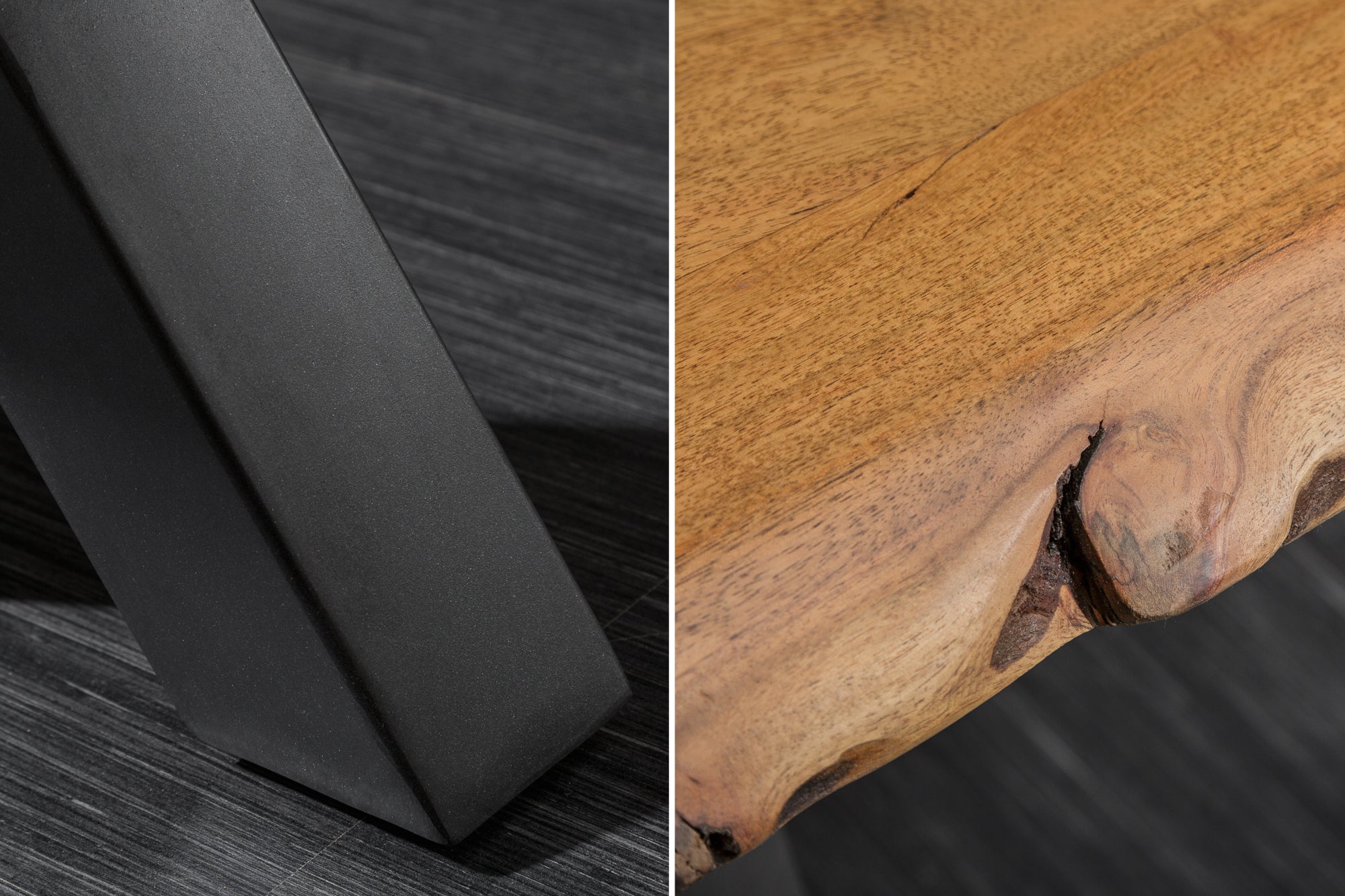 The combination of nature and industrial design is a characteristic feature of the solid Monolith bench. The seat is made of solid acacia in a board thickness of 3.5 cm with a natural tree edge. The manufacturer used an ecological and health-friendly varnish for its surface treatment. The seat in combination with the “X” frame treated with dark powder paint forms a harmonious whole. Complete the Monolith dining table with this designer bench and create a unique space for dining or sitting in your home.