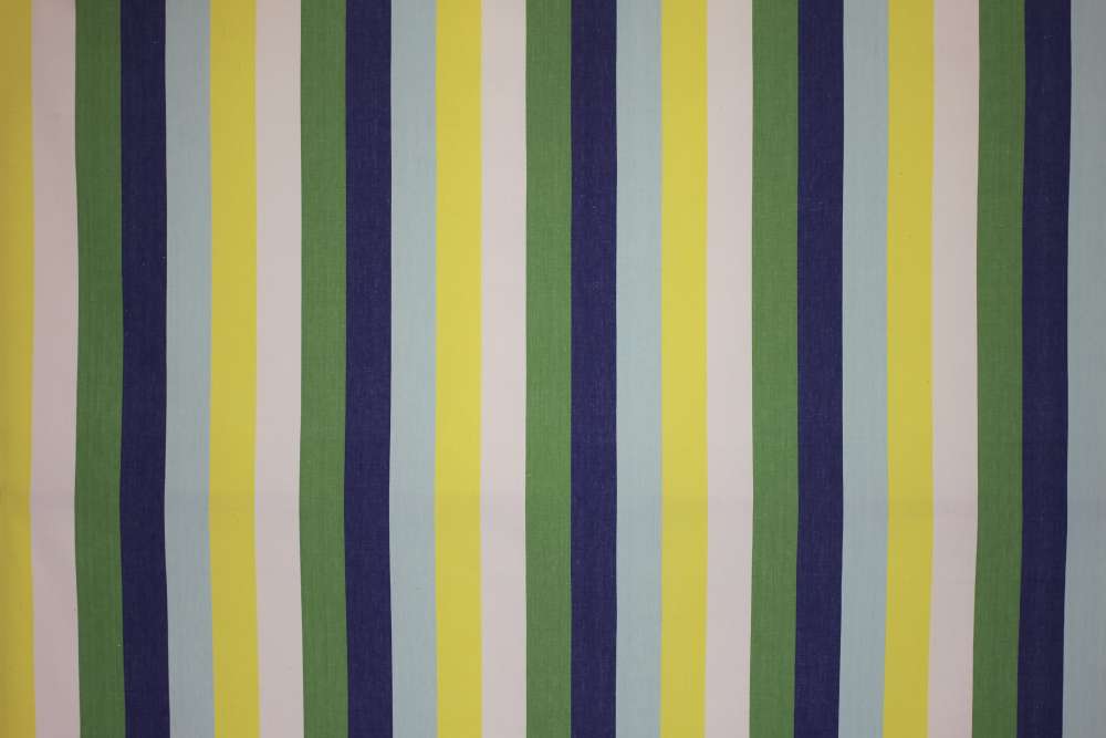 Blue, yellow and green stripe fabrics 150cm wide interior curtain and upholstery striped fabrics. Ideally suited for upholstery, making curtains, roman blinds and soft furnishings. 100% yarn dyed cotton