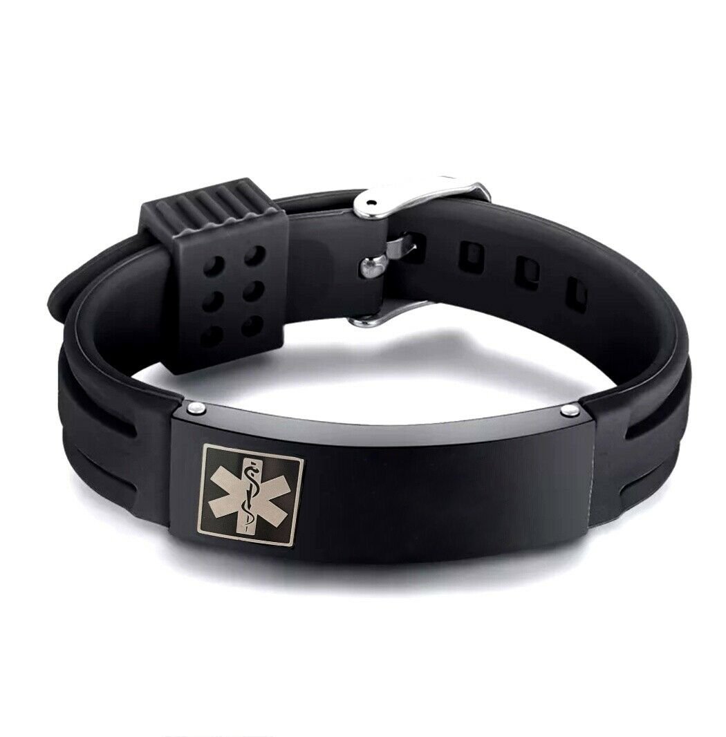 Premium quality silicone band with a stainless steel tag for engraving. These customisable medical alert ID bracelets provide a smart casual look perfect for everyday wear. The adjustable band with stainless steel clasp is hardwearing and has a strong securing silicone safety bar to prevent accidental opening. Comes with a gift bag. Product Features: Style/Shape: Rectangular ID tagLength: 17cm – 21.5cm (adjustable)Height: 1.57cmMaterial: Stainless Steel Tag, Silicone Band Engraving Maximum of 4 lines with 25 characters maximum per line. Ensure you include any capital letters where you would like them as the text will be copied exactly as it has been provided. Please note that the more lines / letters added may result in the text to decrease in size. Customised bracelets cannot be returned unless delivered damaged or faulty. We ask that you ensure that the size is correct to your needs.
