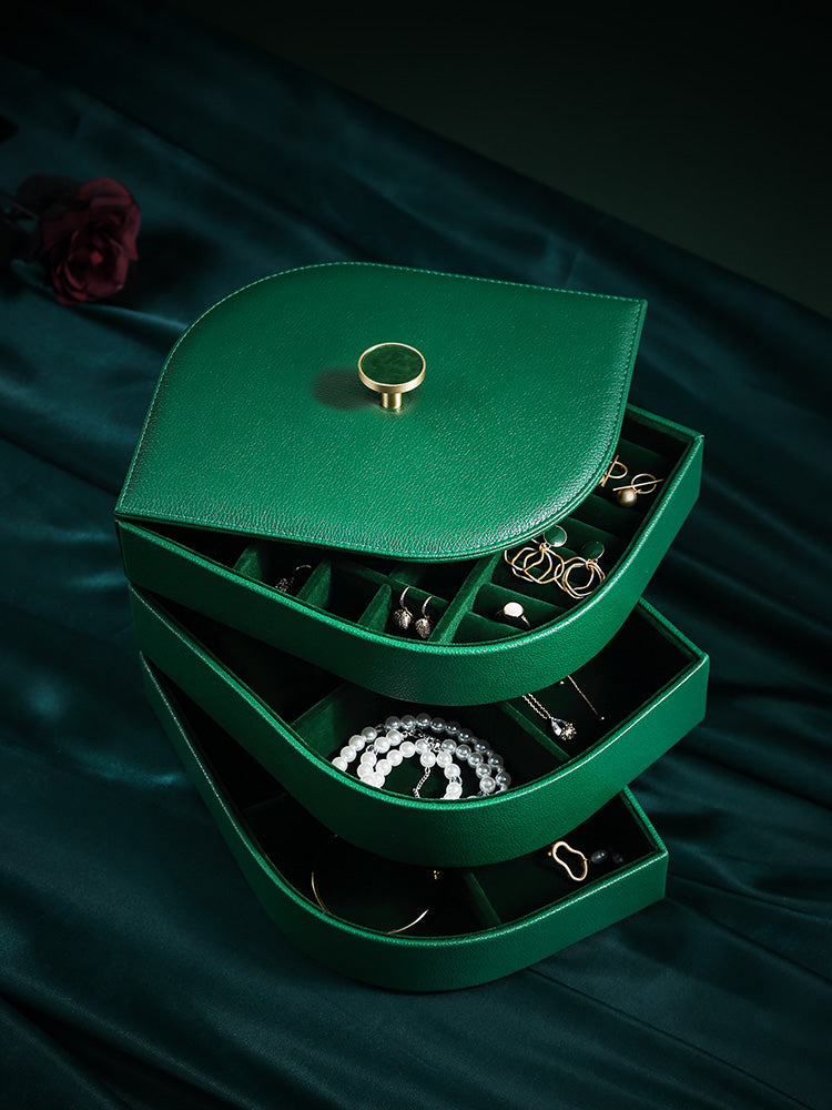One of our most beautiful jewellery organisers yet! The luxurious and extravagant green is the stunning and modern. The 4 tiers are stacked securely on top of each other with a bejewelled lid, the tiers can be separated for easy perusal of your chosen jewellery pieces. Each tier has well compartmentalised storage ideal for rings, earrings, bracelets and necklace organising.