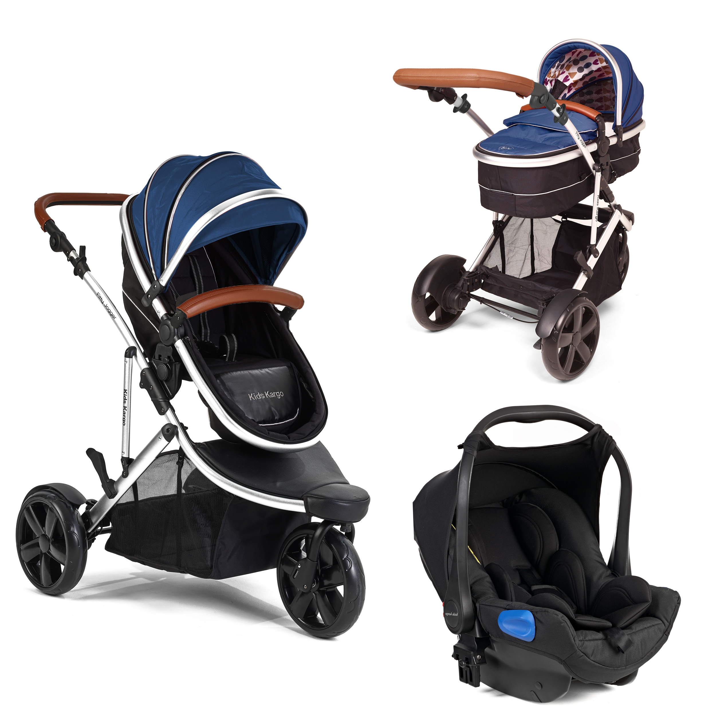 Jogger Jr + Tan handles Suitability newborn, up to 3 years Free tan handle pack Includes 1 x carrycot, rain covers & features Adjust handle Insect net/ sun protection inserted in the hood Fits into small car boots 3 wheeler Kids Kargo 0+ Car Seat Suitable from birth Compatible with Kids Kargo Pushchairs matching coloured hood Padded head protector Padded shoulder pads