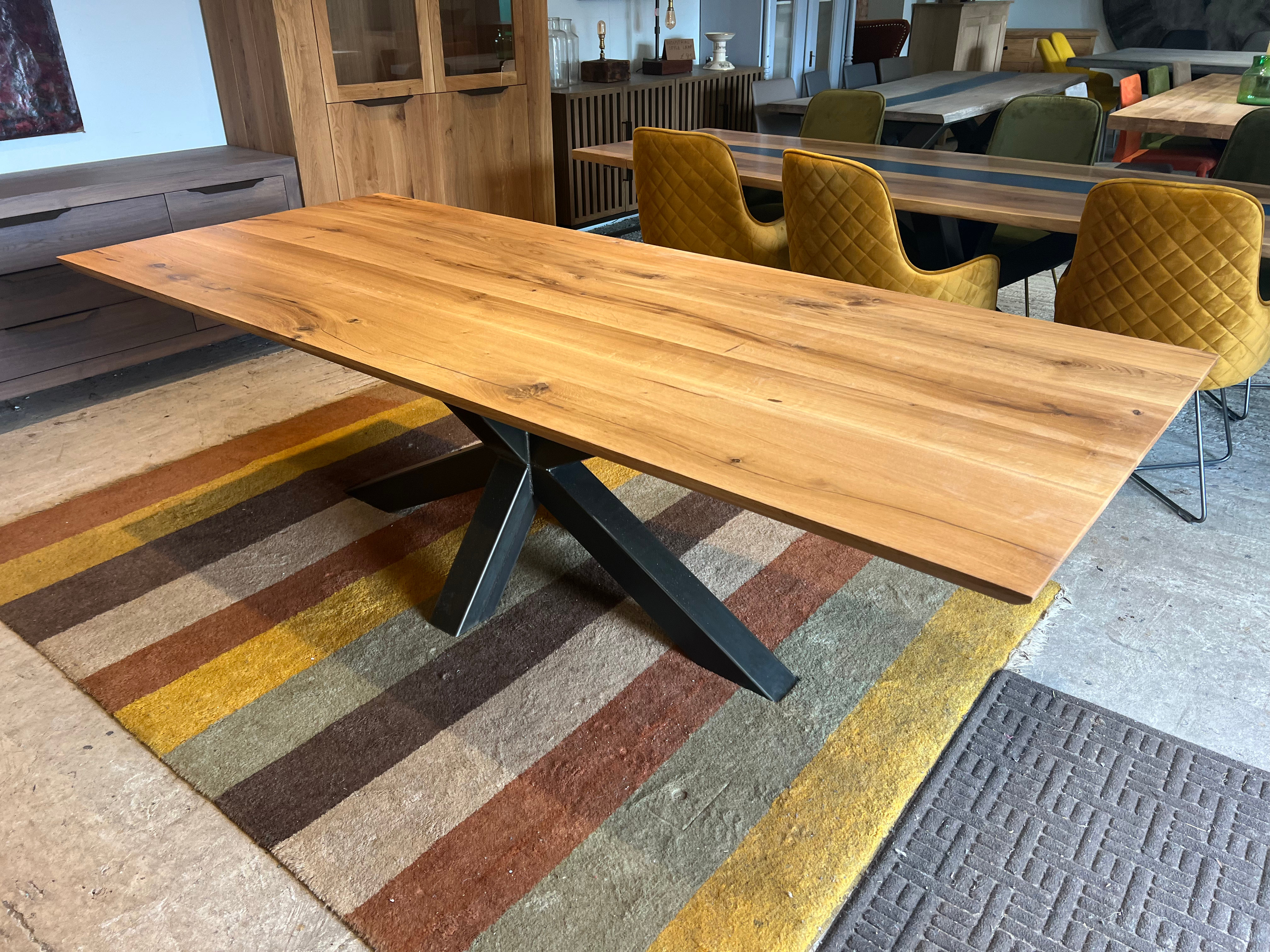 240 x 100 cm oak dining table with a 40 mm solid oak chamfered edge table top. This table has been finished with a clear oil to show off the natural beauty of the oak.This table will seat 10 people comfortably with 4 people down each side and one at each end. We have paired this too with a raw steel spider base, which is great for leg room and looks stunning up against the natural oak. Delivered to your dining space within 3 weeks. – 240 x 100 cm Natural Oak Table – Ennis & Brown
