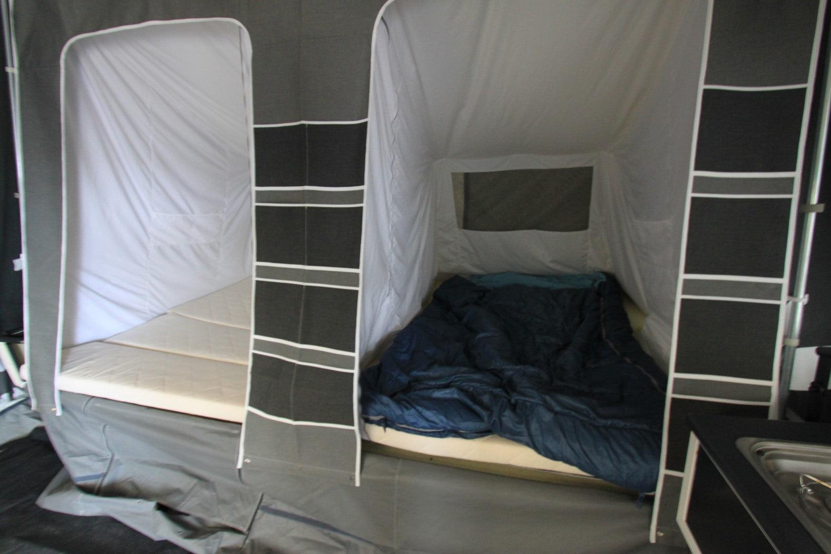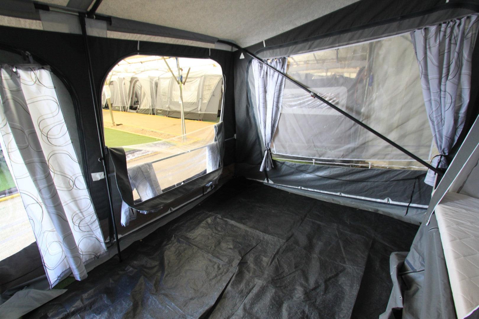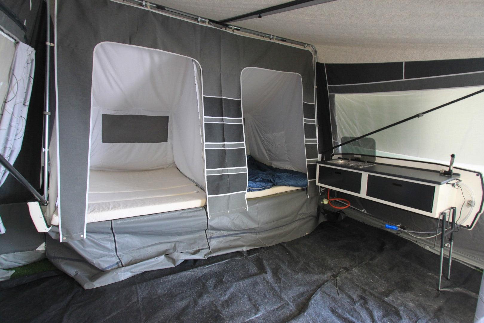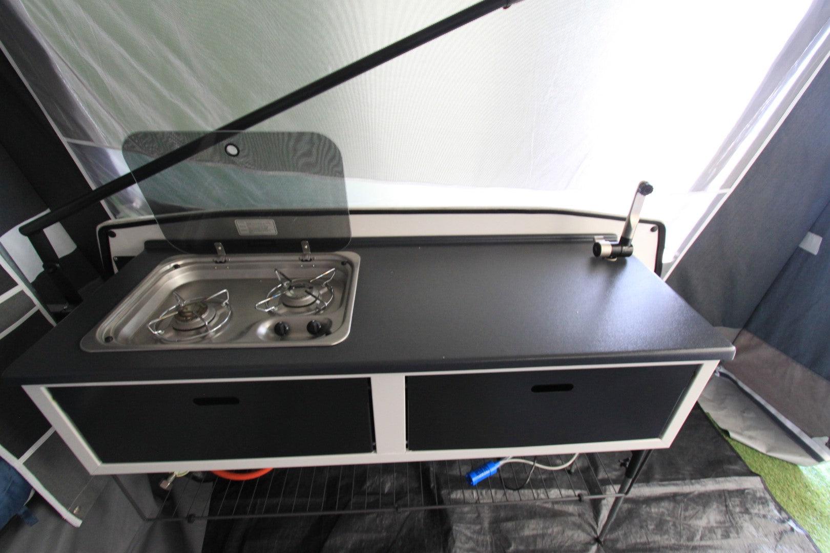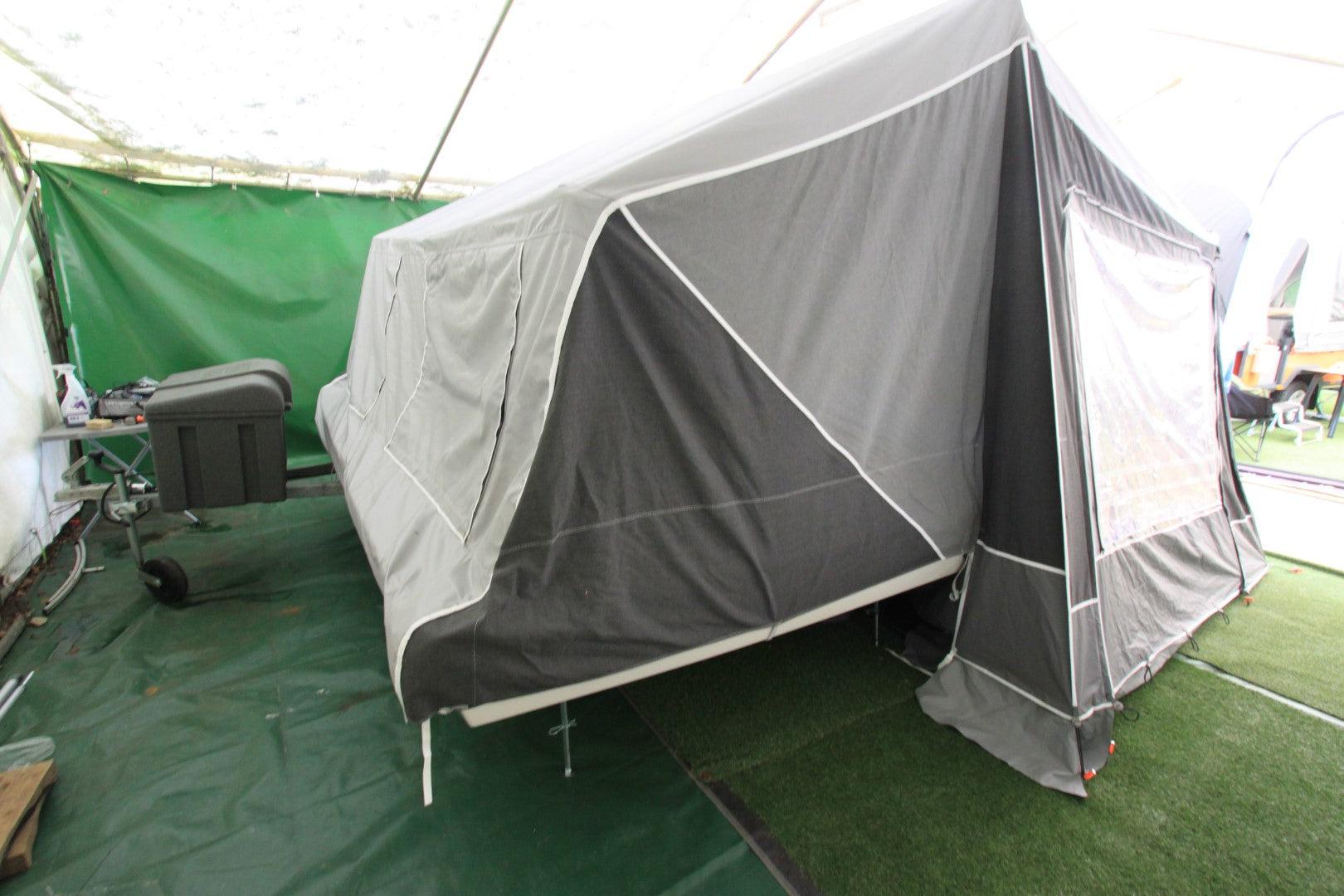 Camplet Classic Beautiful, quick erect 2/4 berth High Quality Trailer Tent. Pull Over ‘pram hood’ type awning erection. High Quality Isabella acrylic canvas. Swing Out kitchen unit, front storage box