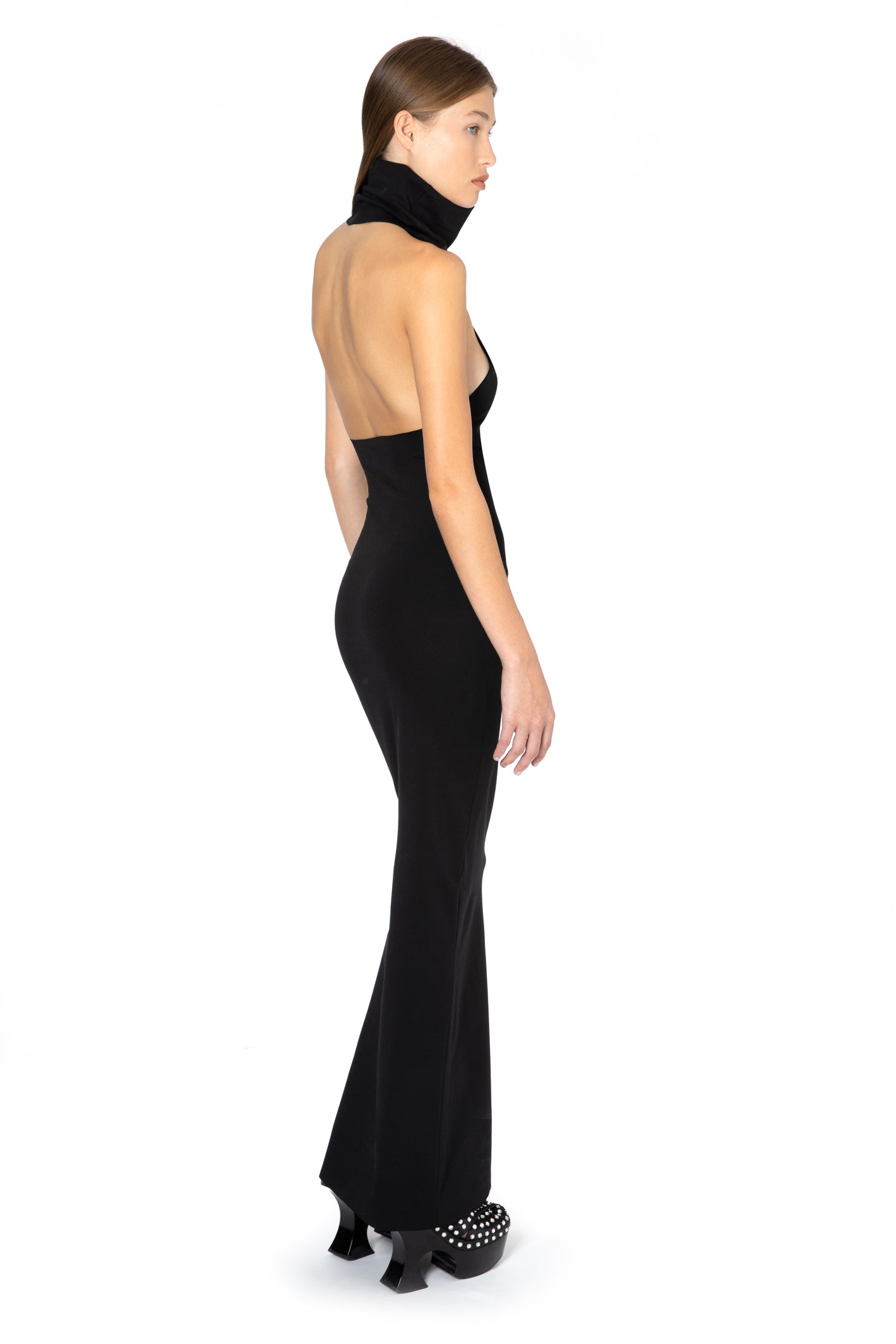 THE CASSANDRA MAXI DRESS IN BLACK IS AN OPEN SHOULDER DESIGN AND HAS A SPLIT UP THE SIDE. IT CLOSES AT THE BACK OF NECK WITH A ZIP.Â