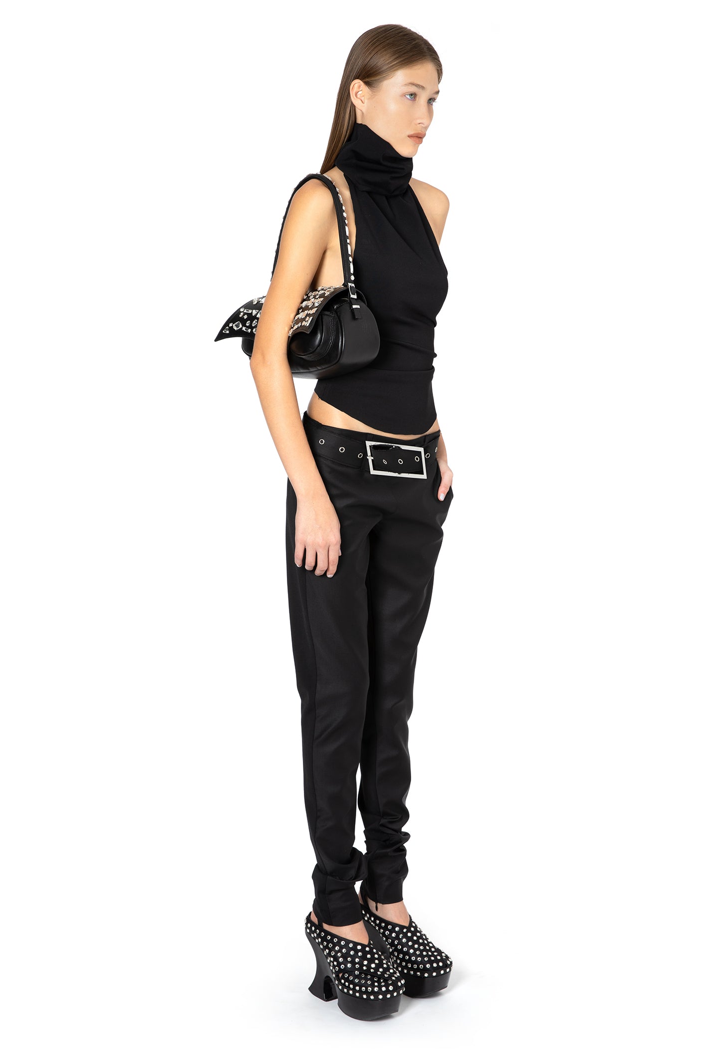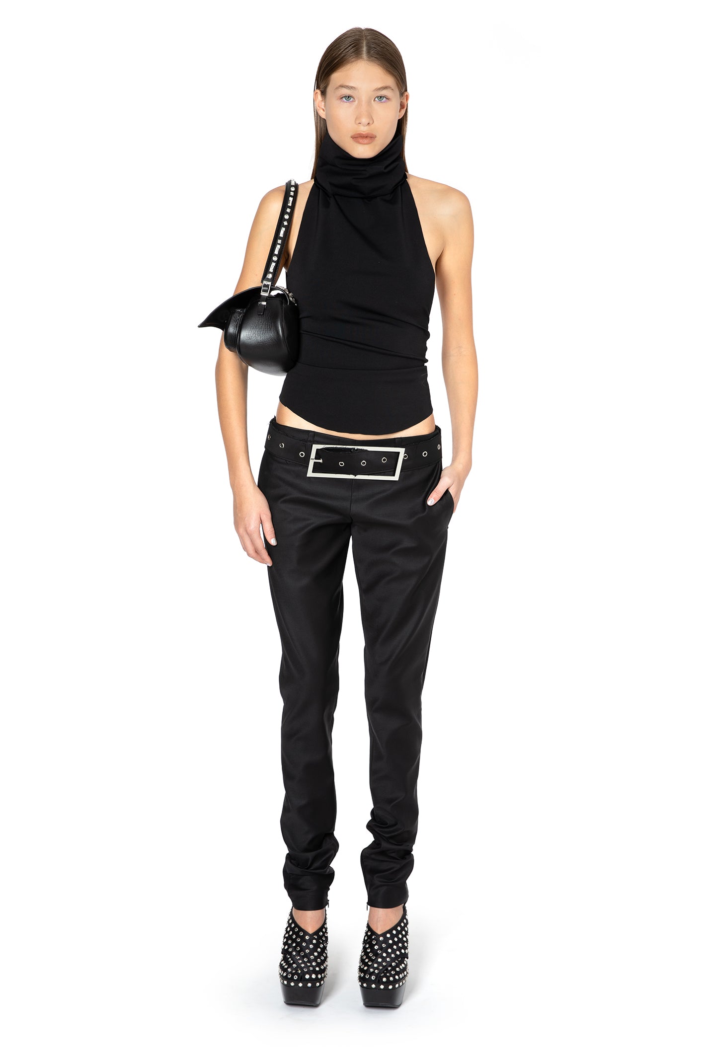THE CASSANDRA TOP IN BLACK IS AN OPEN SHOULDER DESIGN. IT CLOSES AT THE BACK OF NECK WITH A ZIP.Â