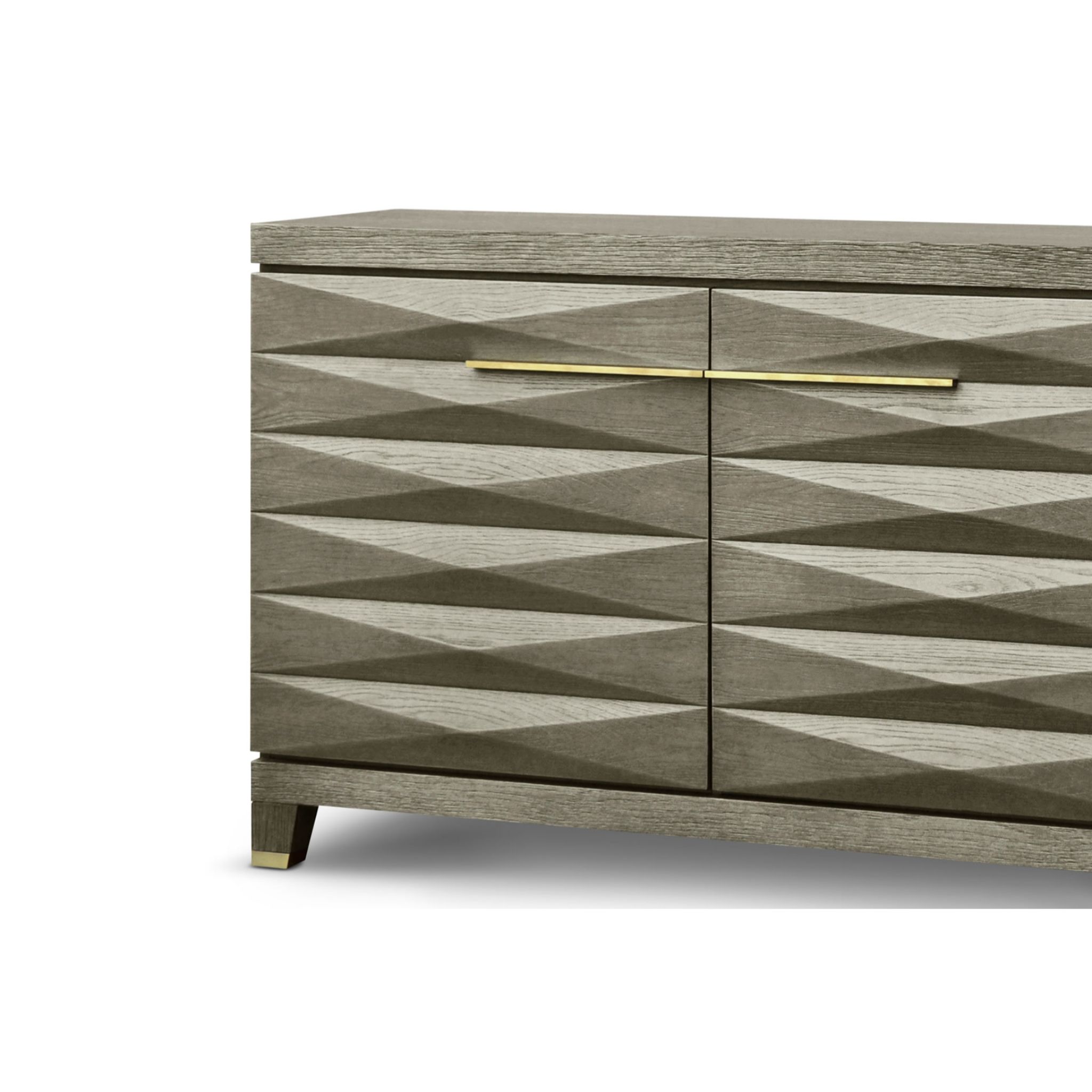 The Cassis 2-Door Console comes in a striking diamond shaped design, which is finished in textured grey/taupe coloured oak veneer, and is fitted with gold handles. Modern with an inspired design, the Cassis Console can help achieve the perfect finish in any home or interior design project and coordinates perfectly with the Cassis Coffee Table as well as the Cassis Media Unit and the Cassis Sideboard.