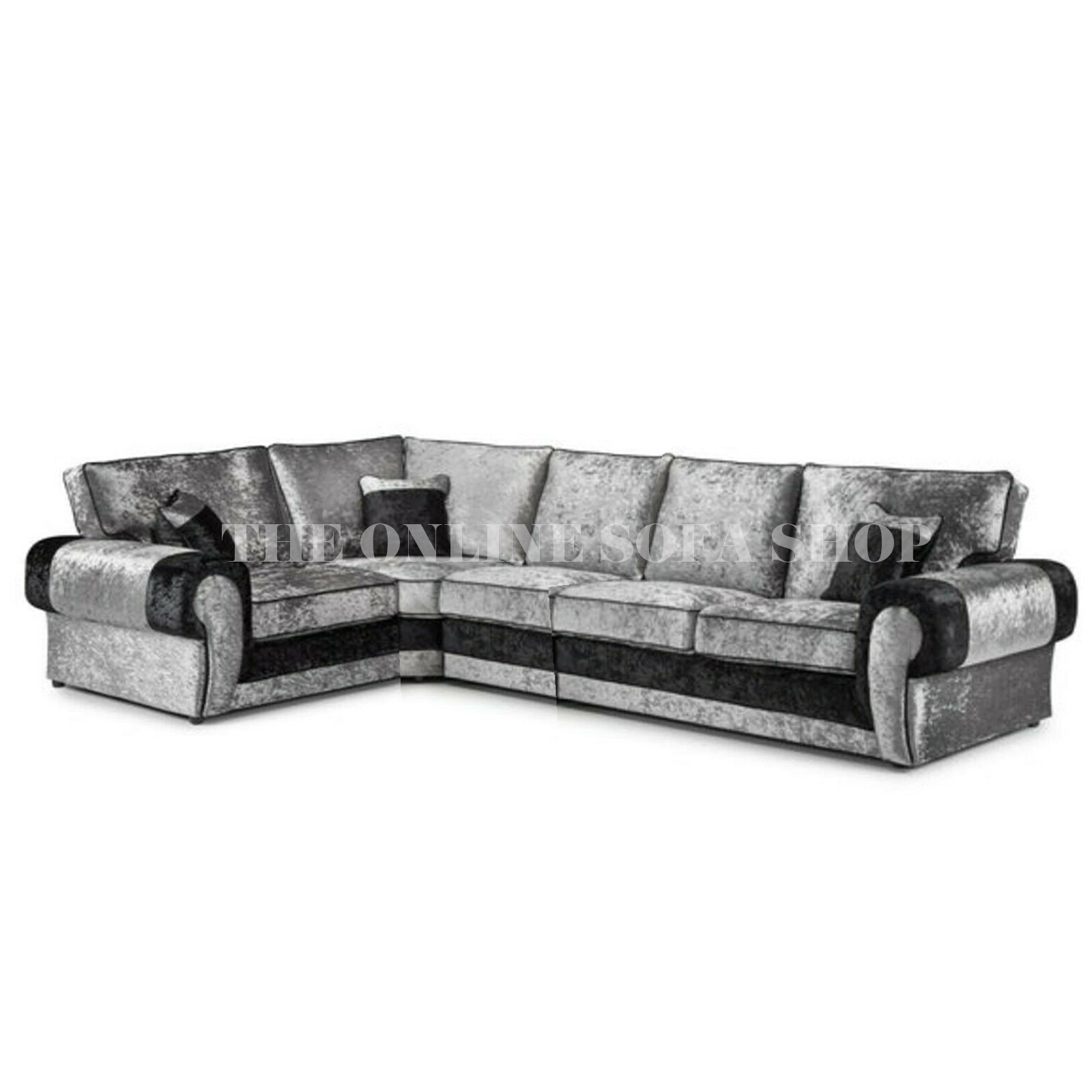 Specification: Chelsea Crushed Velvet Long 5 Seater Corner Sofa – Black and Silver – Left Hand Facing – The Online Sofa Shop