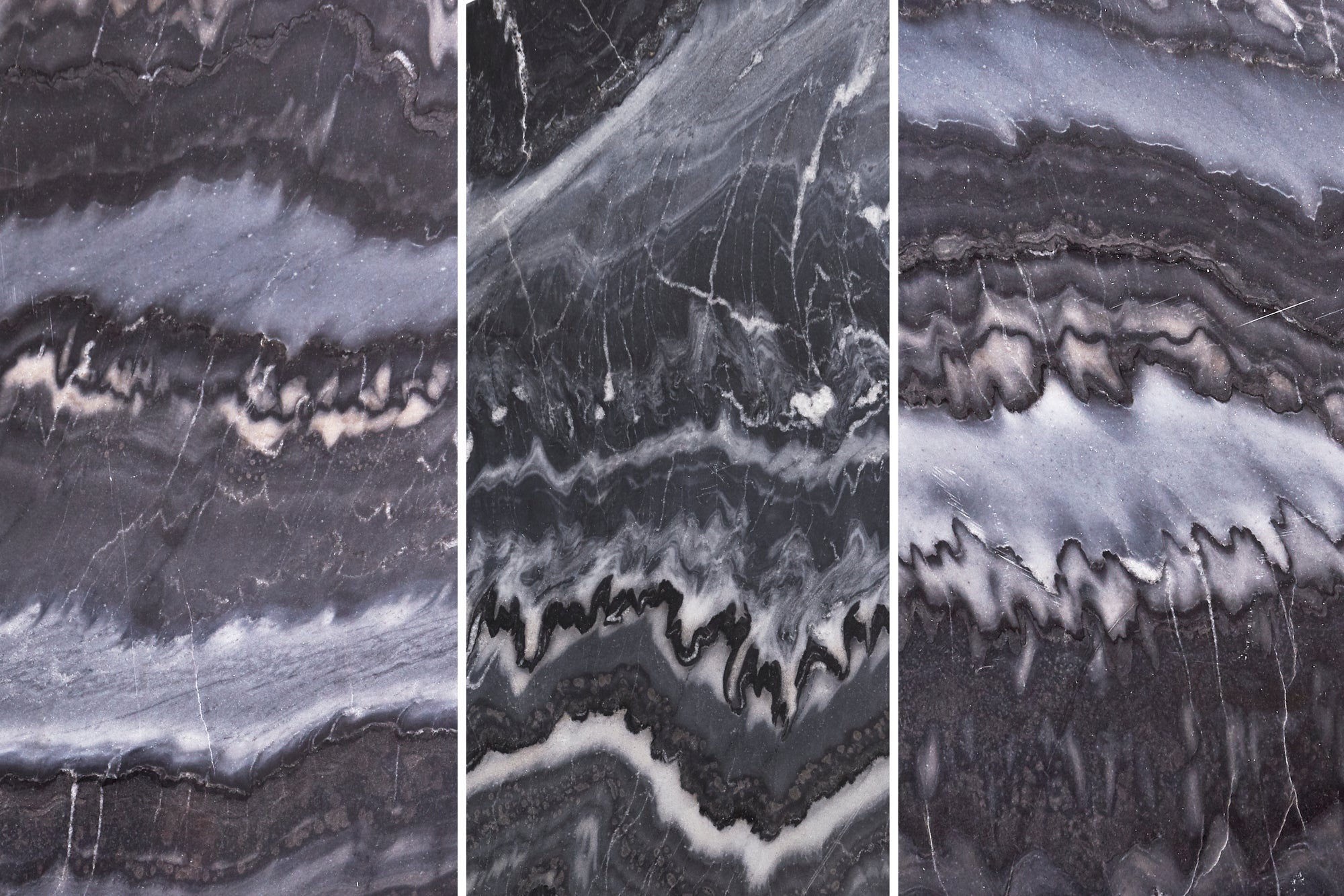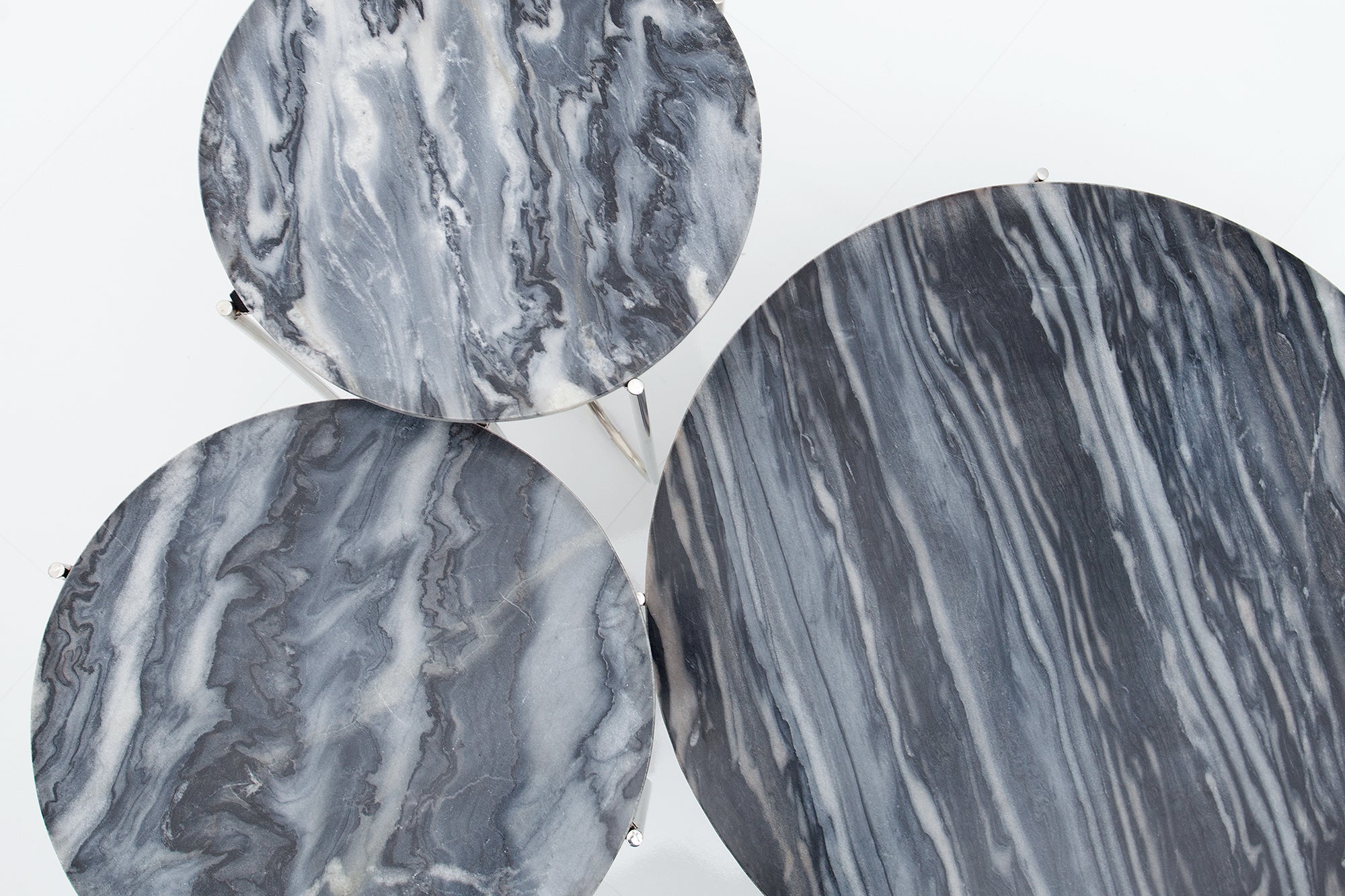 The round tabletop made of grey marble is without question the absolute eye-catcher of this extravagant coffee table . Carefully polished, marble shines like no other natural product and reveals its individual grain, which has arisen over millennia of geological processes. The numerous grey nuances of marble seem to merge with each other like clouds and result in a unique pattern that makes every side table unique.