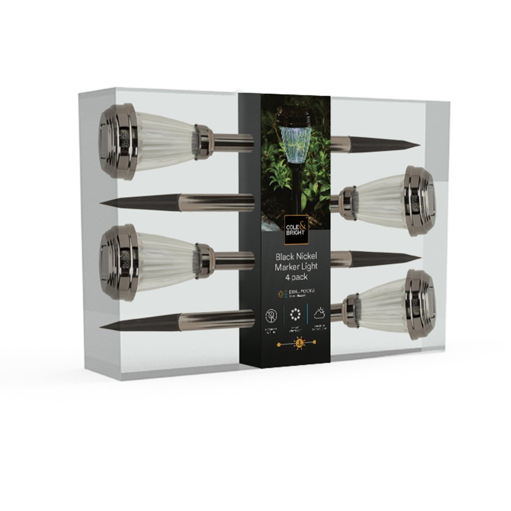 Cole & Bright Black Nickel Marker Light 4 Pack Light up outdoor pathways and driveways with this stylish Solar Black Nickel Marker Light Pack of 4. With its slightly more traditional design, it will be a welcome addition to any garden. It has dual power technology. Powered by solar energy and a battery back up, light is guaranteed 365 nights a year. No matter the weather! Features: Emits 3 lumens of light On/off inbuilt timer switches light on at dusk and off after 8 hours White LED Rechargeable and alkaline batteries included H 40cm x Dia. 9cm