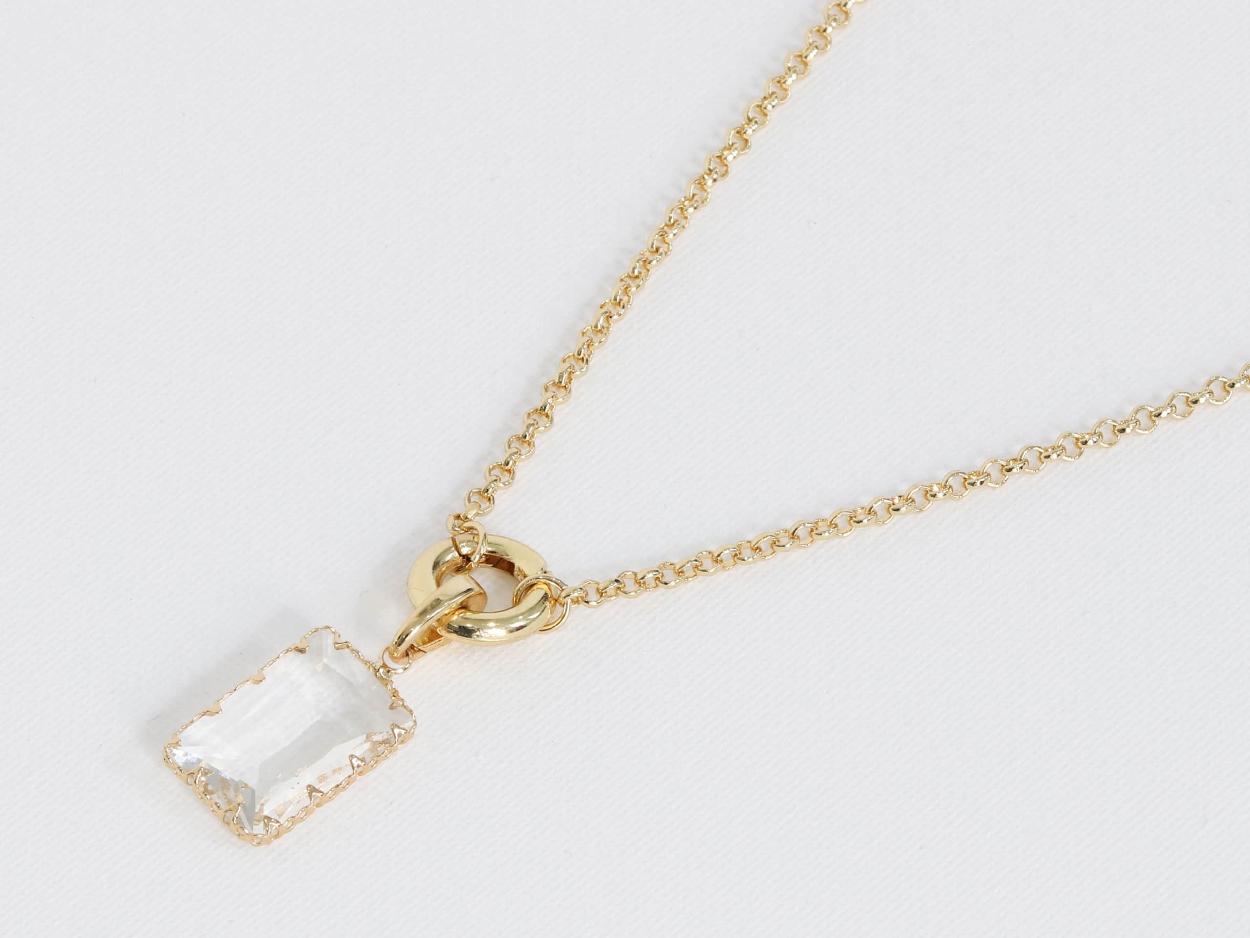 Opt in for this 3mm gold plated belcher chain necklace to elevate your look. Suspended from a lock mechanism, that allows you to add or remove charm, are two hand cut glass stone charm, offset with a fancy setting for an elegant, yet modern look.