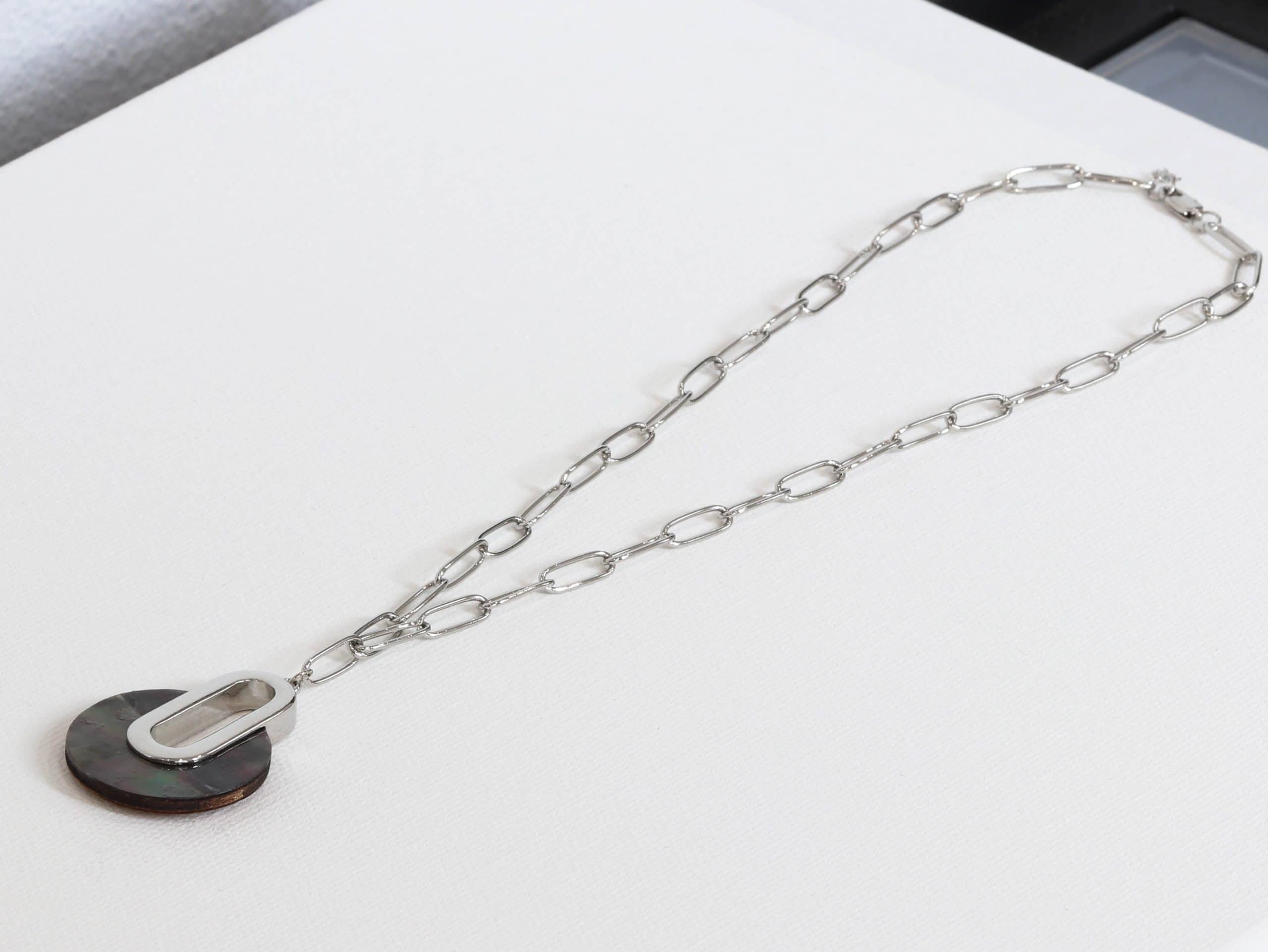 Combining shell on wood with resin, this geometrical chain necklace lends a pop of discrete tone, completed with lobster clasp and extender chain.