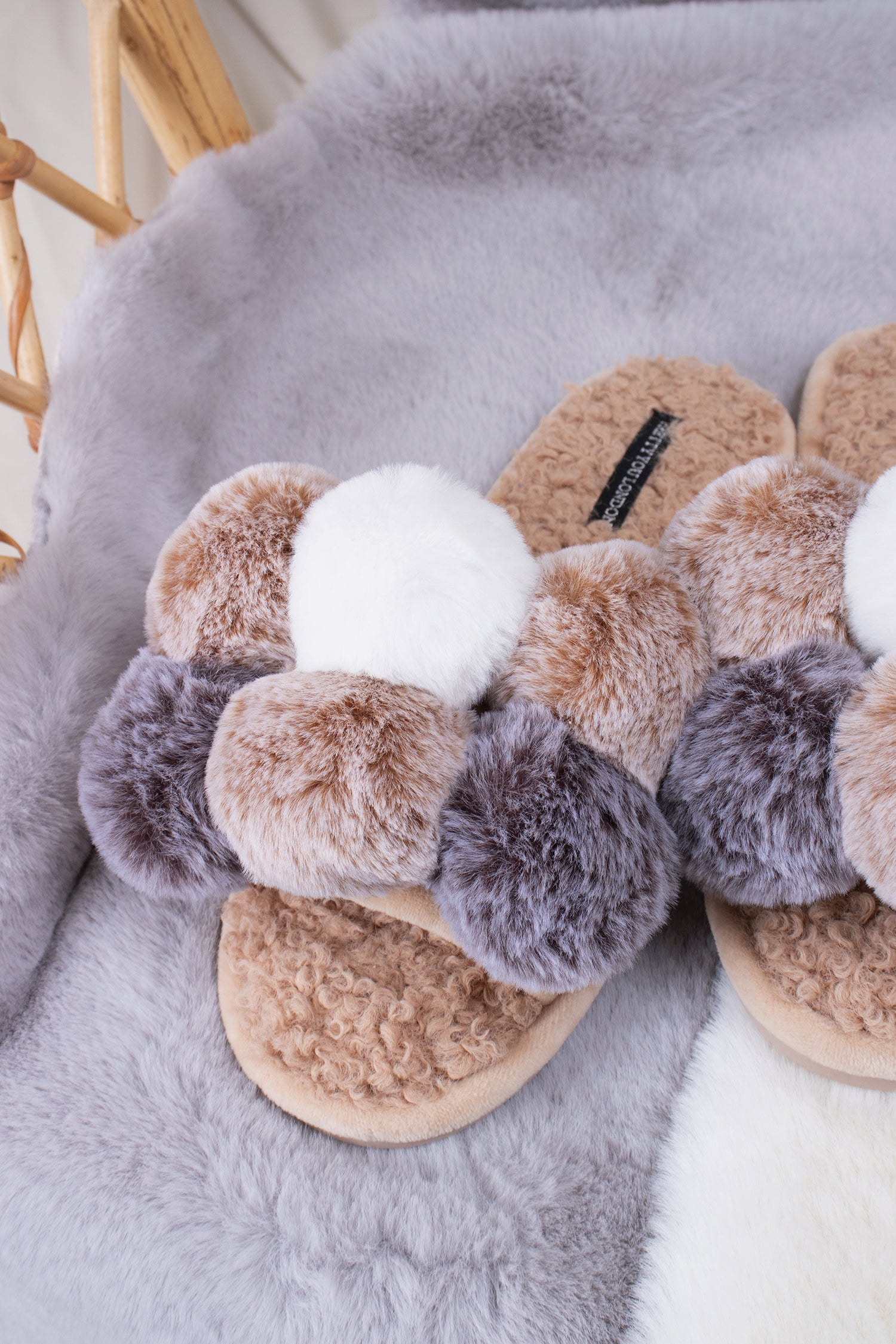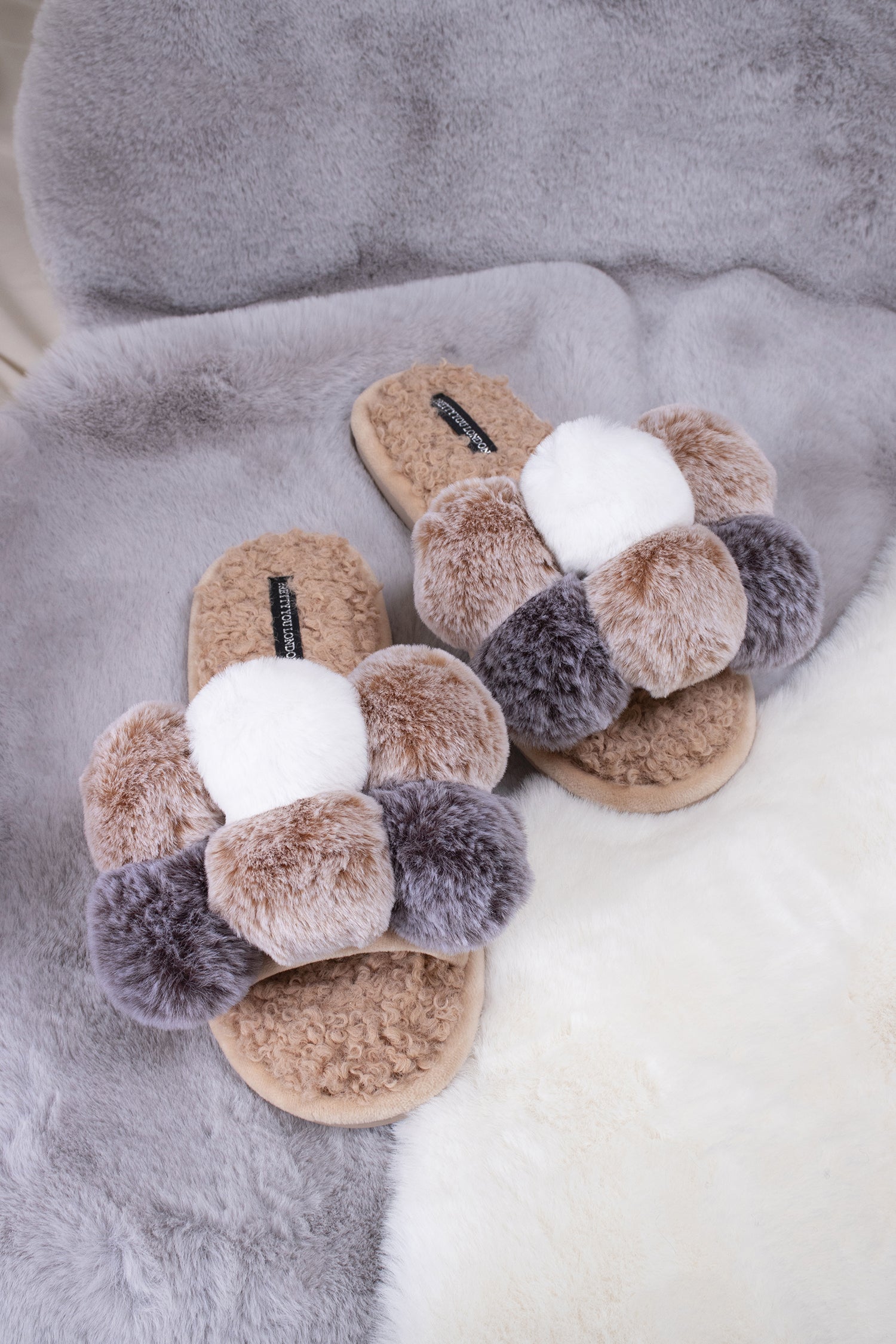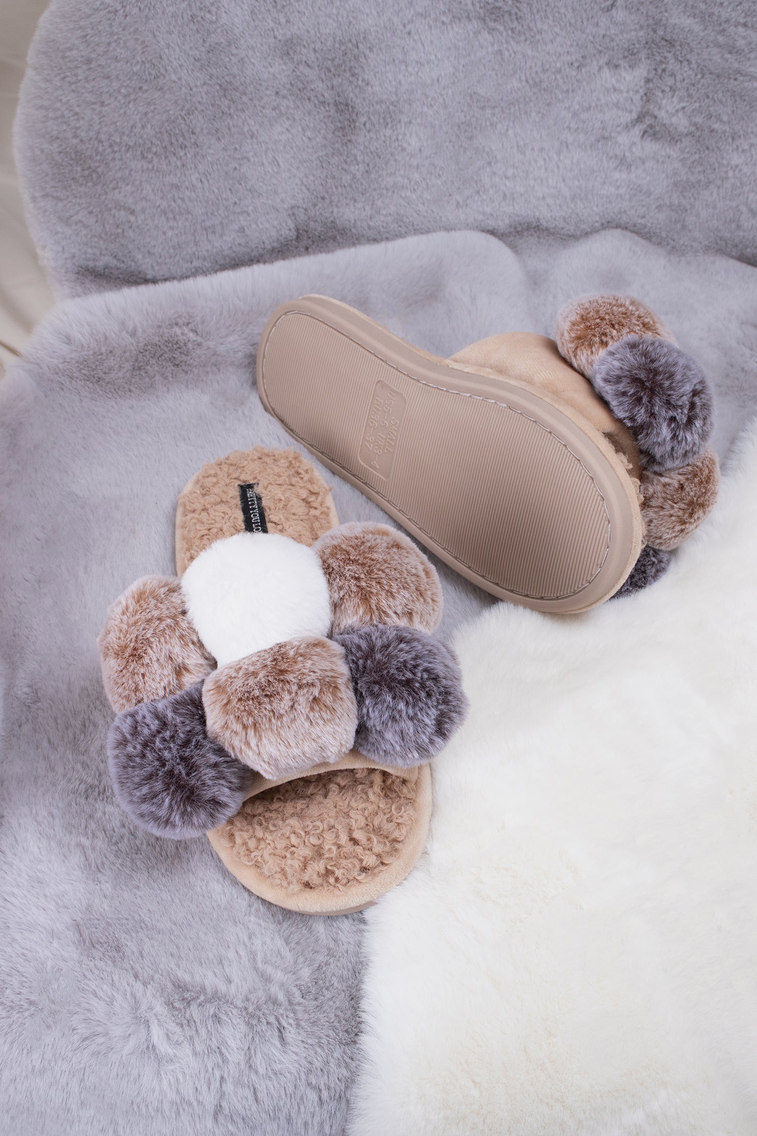Sister style to the popular pom pom slipper Dolly Multi-coloured muted tonal poms Ultra padded curly faux borg insole offers long-lasting comfort Hard-wearing non-slip sole Are you a big fan of our Dolly slippers? Meet Daisy, Dolly’s long-lost sister! We’ve taken all of the best features of Dolly and added a little extra luxe… Tipped faux fur poms decorate a soft-touch velvety velour band, with a curly fur insole for an added comforting feel. Available in 2 mixed colours; Cloud and Natural. And of course, why have one pom when you can have six? Pair with our Bamboo Cami Short Set in Cream for a complimentary pairing. Details Sizing Information: S = UK 3-4 / EU 36-37 / US 5-6M = UK 5-6 / EU 38-39 / US 7-8L = UK 7-8 / EU 40-41 / US 9-10 Fit Information: Fits true to size. Standard width fitting. Packaging Information: Recycle card hanger and recycled bag Care information: Wipe clean with a gentle cleansing wipe