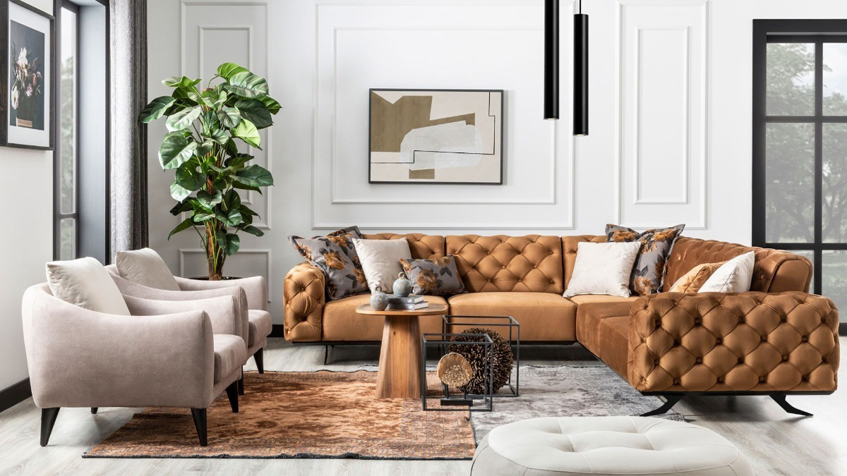 Colour of the legs can be customizable. (IF APPLICABLE) – Dallas Corner Sofa – Velvet 734 Orange – Stain Resistant – 2 Year Manufacturer Warranty – Novia Furniture
