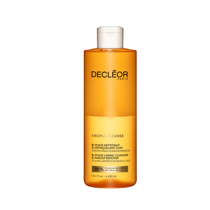 Decleor Aroma Cleanse Bi-Phase Caring Cleanser Makeup Remover 400mlIf you re wanting to get ready for the day or wanting to wipe the night away, Bi-Phase Cleanser Makeup Remover is all you need to rejuvenate replenish your skin leaving it with a beautiful glow whilst hydrating leaving skin soft smooth. Bi-Phase Caring Cleanser Makeup Remover is powered by a perfect blend of precious floral water virgin botanical oils.The Bi-Phase is made up of 100% natural ingredients.