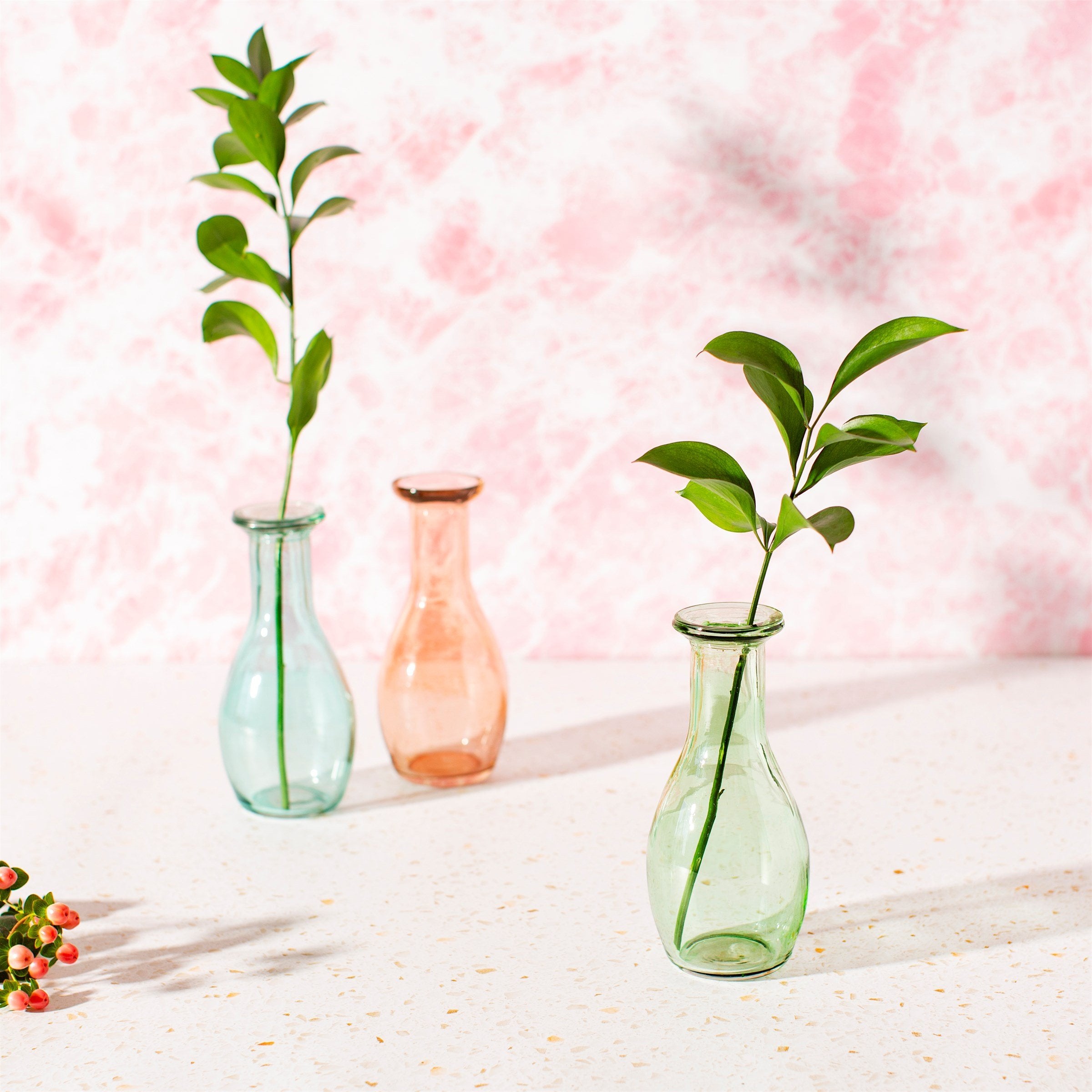 Sass & Belle Recycled Glass Bottle Vase Pale Pink. Deepa vase perfect for a home which love pops of colour. Made from recycled glass with a pastel green glaze. Each one from the set of three has a unique shape with a rounded base and narrow neck. Perfect for displaying mini bunches of blooms. We stock these vases in pink and green. We stock these vases in pink and green.
