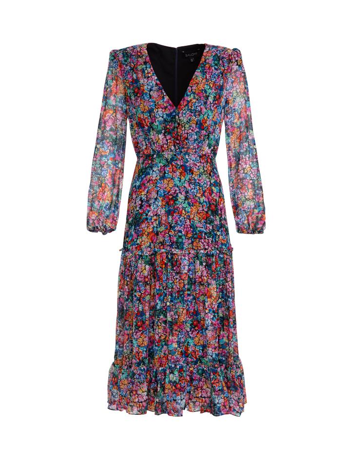 Description Flattering and feminine, our best-selling Devon dress is updated in our new crackle bloom print for the summer season. With an intricate floral print, this dress is crafted from silk with a delicate sheen that that lends it an air of elegance, making it perfect for evening events. Featuring a V-neckline and a blouson bodice, this midi length dress has full length sleeves with a gentle puff and a ruffled tiered skirt that is ideal for dancing in. Details • Printed Silk Georgette midi dress• Fine gathers at shoulder seam• Tiered skirt with small frill• V-Neckline• Long sleeve with gather details• Gathered bottom tier• Blouson waist• Concealed center back zip• Elasticated cuff• Fully lined except for sleeves• Length on UK size 8 is 99.9 CMComposition & Care Outer: 100% Silk, Lining: 100% Polyester Delicate Dry Clean Only. Avoid Contact With Suntan Lotion / Oils And With Harsh Chemicals