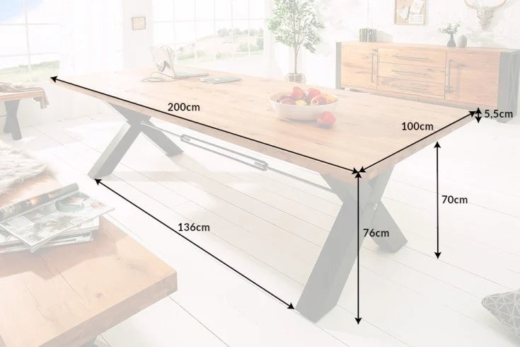 This dining table is a unique piece that looks particularly authentic and natural with the rough structure of the top, which is made of oiled oak wood. The X-frame made of metal creates an angular industrial design that will be an eye-catcher regardless of where you place it.