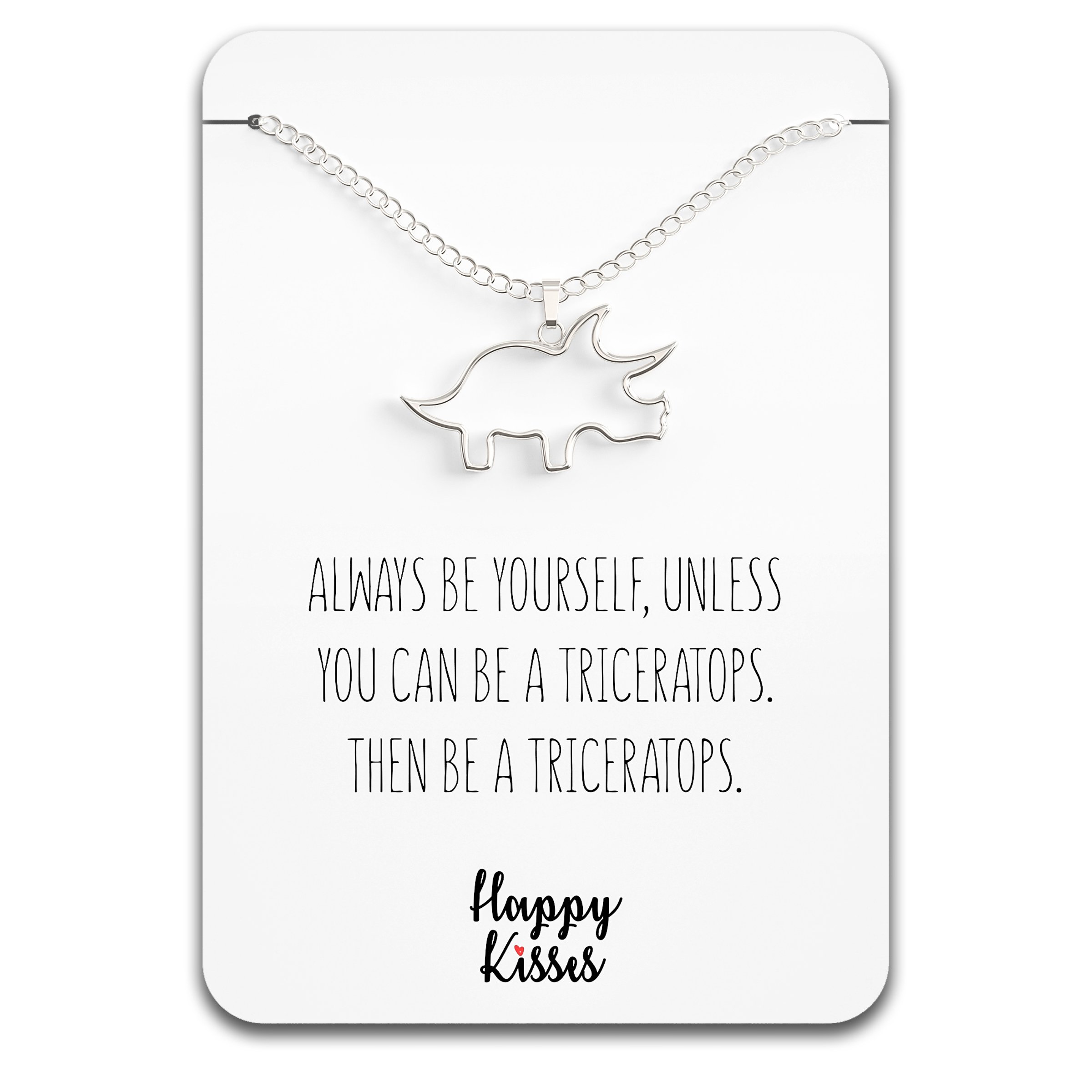 Dinosaur Triceratops Necklace – Cute Pendant With Sweet & Funny Message Card – SIlver, Rose Gold, & Gold Silver – Happy Kisses