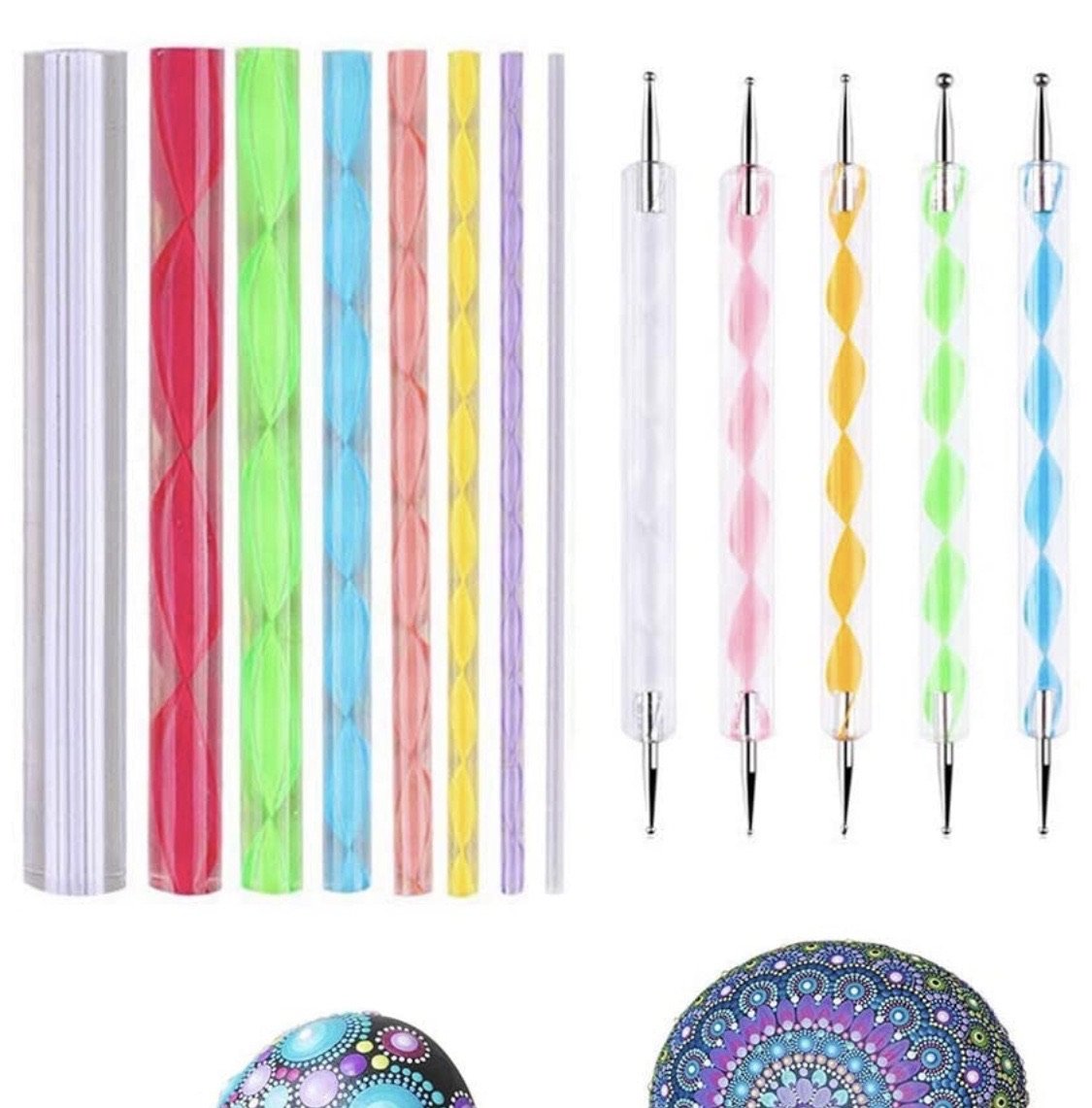 Set of 13 pieces Mandala Dotting Tool Kit.8 Pieces of Twisting Acrylic Rods and 5 Pcs Twisting double sided dotting tools.Twisting Acrylic Rods: 8 different size acrylic rods, each length is 12 cm, diameters are 3, 4, 5, 6, 8, 10, 12, 15 millimetres. Twisting Double Sided Dotting Tools: 5 different size mandala double sided dotting tools, each length is 13 cm, diameter are 0.8-3 millimetres.Easy to Clean and Reuse: The acrylic plastic mandala dotting tools and stainless steel ball stylus are easy to clean with a damp cloth.Lightweight and Portable: You can paint the dots for hours without fatigue.A New Hobby for Everyone: You don’t need special skills or talent, with our dotting painting tools, you can make those beautiful and unique patterns. Everyone can be an artist. It can be used as an exercise for meditation and is a tool for therapy or simply relaxation. It’s an ideal starter kit for a newbie or as a gift!Ideal addition to our Rock Painting Kit or Pottery for Unlimited Creativity! Can also be used for nail polish and gel nails!*colours of tools may vary from pictures shown