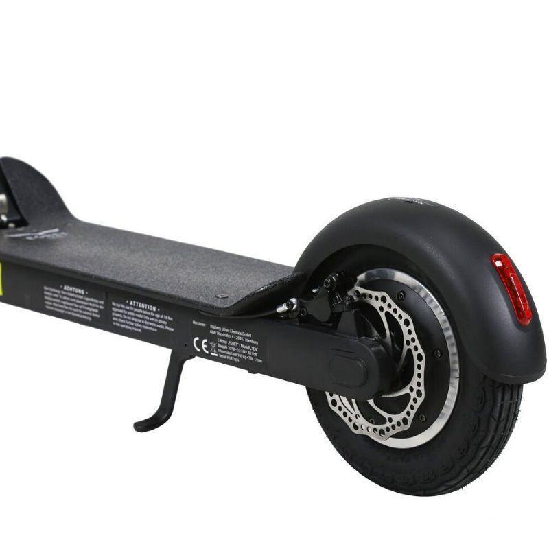 The scooter can be quickly folded ( 107 x 18.5 x 38 cm ). The compact pack size and a total weight of only 17 kg allows you to easily transport it, put it into the trunk of your car or take it with you on public transport. Unfolding is just as easy. The dimensions of the unfolded scooter are 115 x 54.5 x 95 – 115 cm .