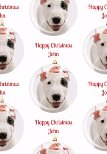 This personalised wrapping paper gives us the mashed banana effect, so cute! Your friends and family will adore this English Bull Terrier Christmas wrapping paper. He’s a professional at wearing that hat!