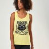 Because this colour is in fashion this summer, the Charly tank top is lemon yellow. The colour has been washed out to give it a soft look. On top there is the head of Charly, our naughty cat from this collection. The design is still made by our dear Goldy ;)). Moreover, we have used it on several of our products such as the patch pins… It is surrounded by hot roses. In short, it’s a real badass tank top ! The t-shirt is made of organic cotton and is made in Portugal. The cut The cut of the yellow Charly tank top is loose. Then, it is notched under the arms so as not to feel too tight. The collar is a bit low cut. Like all the cuts of the brand, it adapts to the different morphology of women. In short, the cut is sporty. You will love this little sleeveless top!