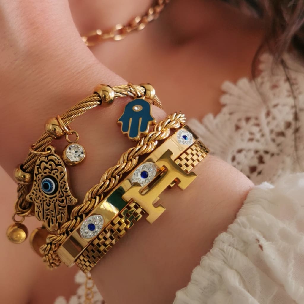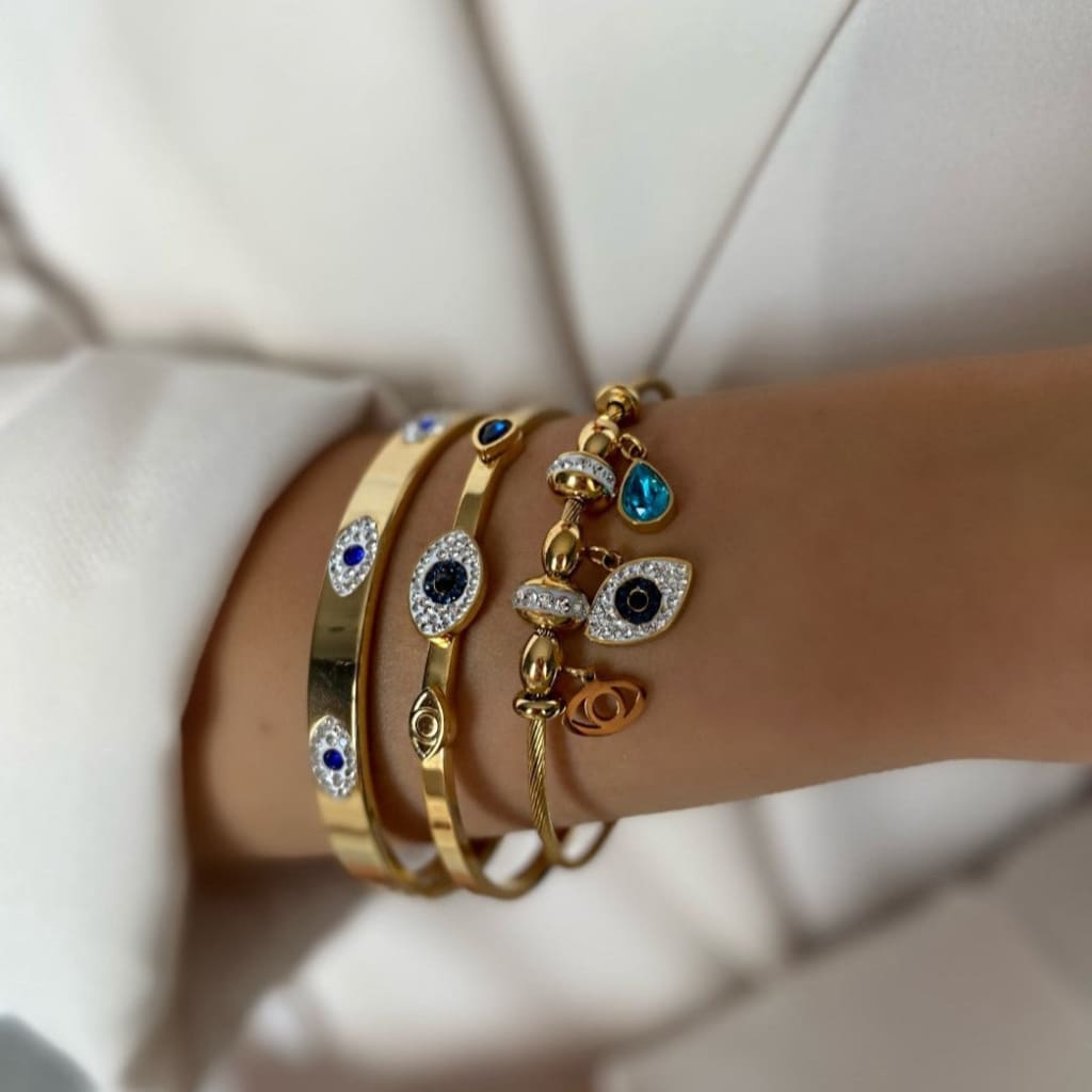 Specification: Evil Eye Gold Bangle Perimeter :17cm – Gold – Ezavision