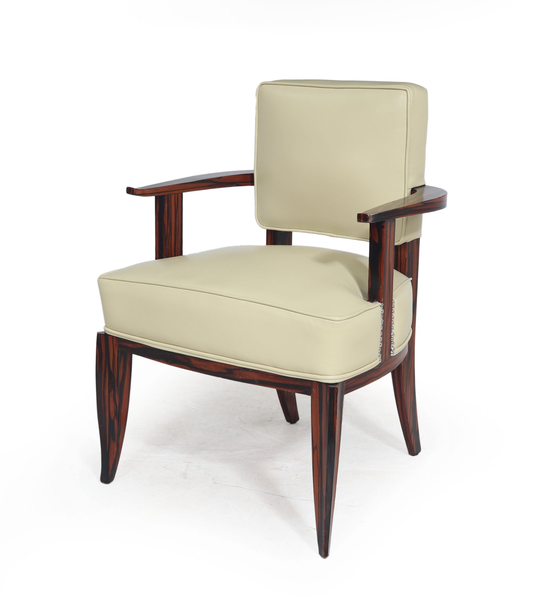 Art Deco armchairs A Pair of French Armchairs of small proportions with sabre legs and shaped details, coil sprung upholstery with new cream colour thick hyde leather covering, fully stripped down with fully polished frames and fully upholstered in excellent condition throughout.
