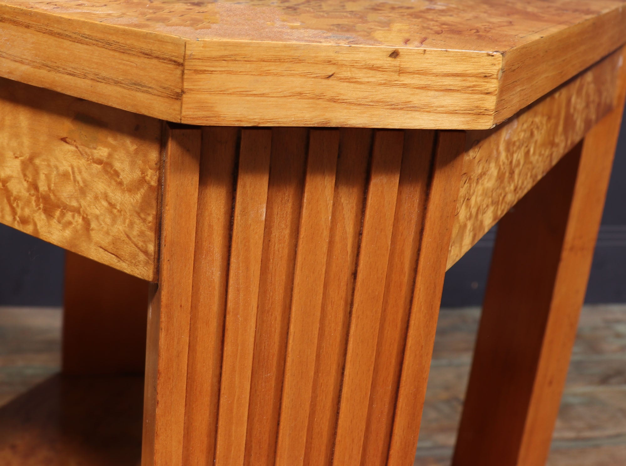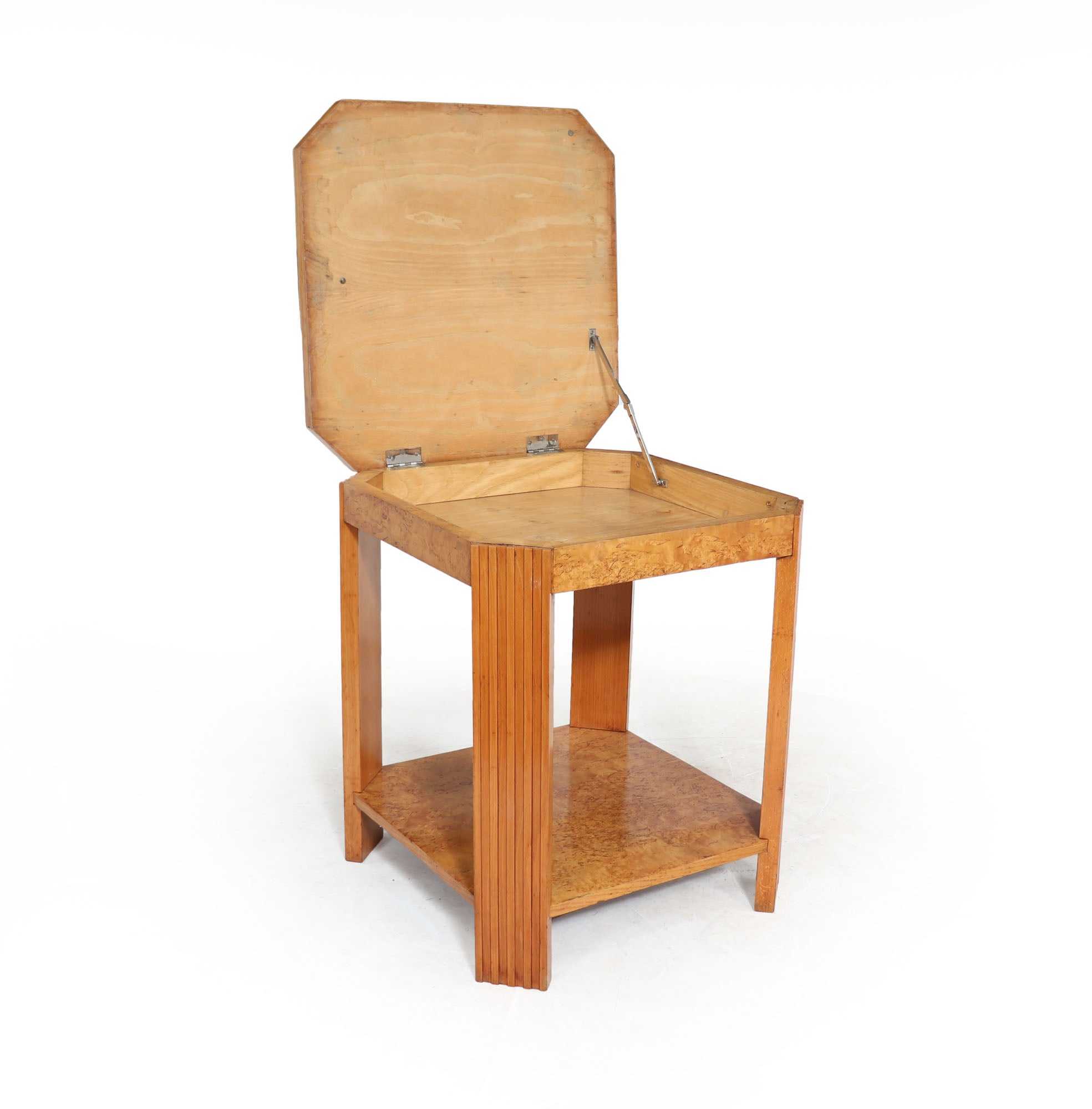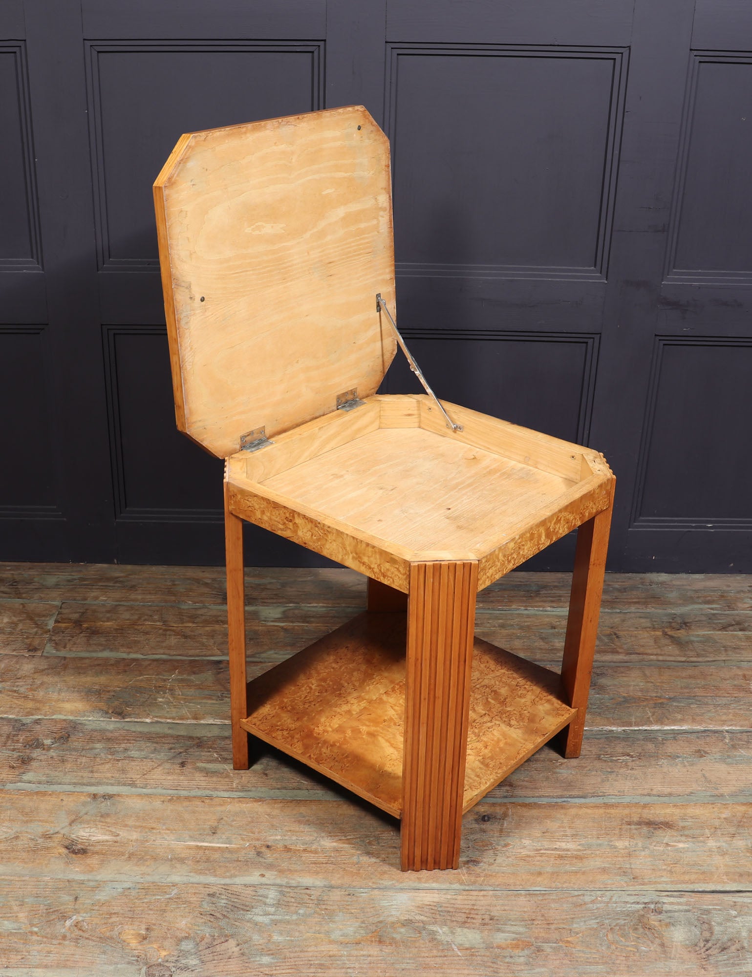 A French Art Deco table produced in the 1930’s in karelian birch with canted corners and reeded leg with a lower shelf, it has an oak lined lift up compartment with chrome fittings, the table has been polished and is very good condition